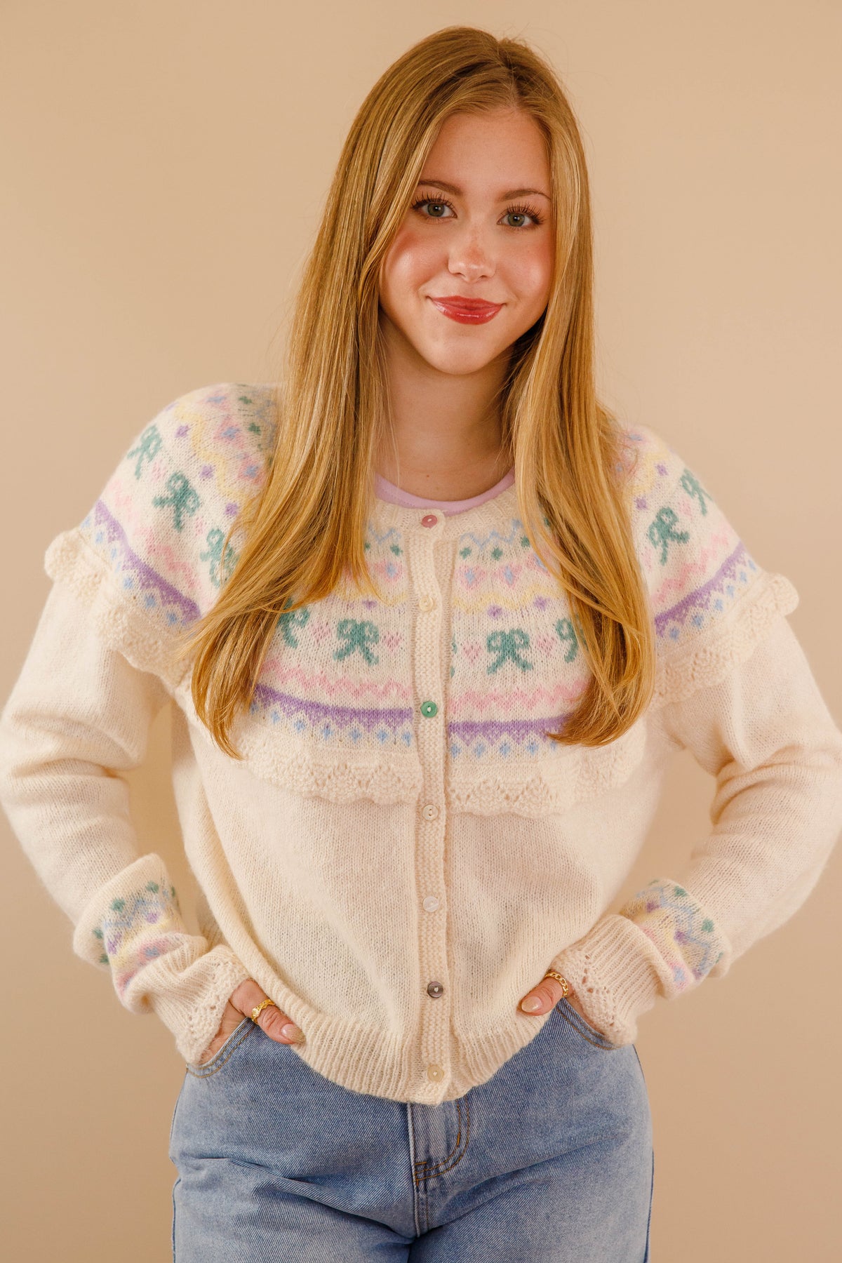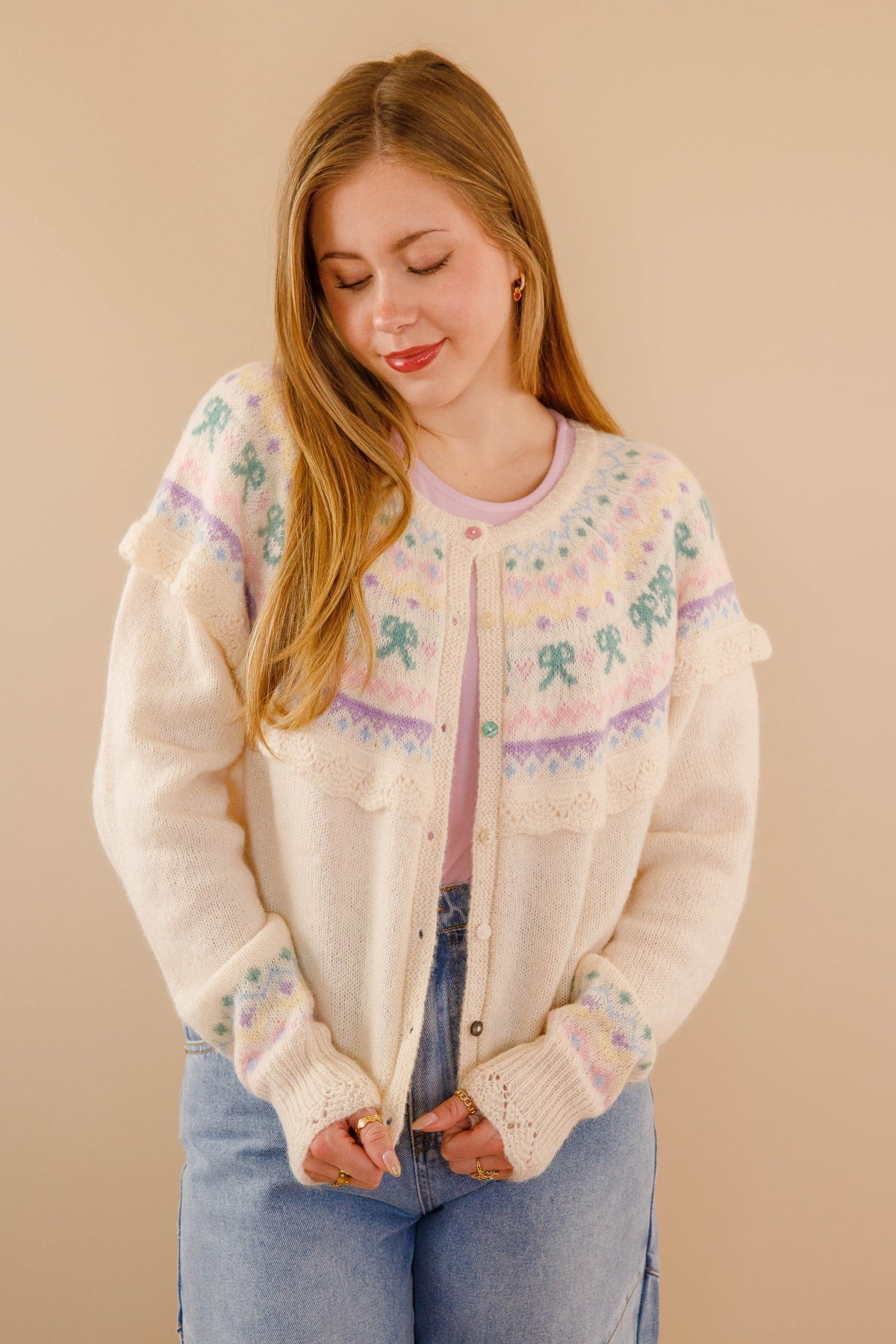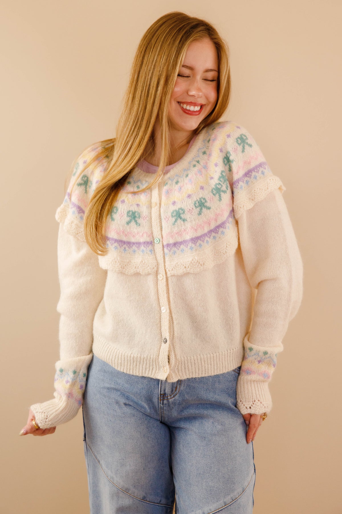 Meet your new favorite layer! This delightful button-front cardigan wraps you in sumptuous ivory knit with a show-stopping Fair Isle yoke that's pure joy. Whimsical bows and cheerful geometric shapes dance across the yoke in dreamy pastels—rosy pink, soft lavender, sunny yellow, and gentle green. A sweet scalloped ruffle frames the design with vintage flair, while charming pastel buttons in different shapes add personality to every closure. The cozy crew neckline and ribbed cuffs tie the whole look together beautifully, making this a piece that's as fun to wear as it is to admire.