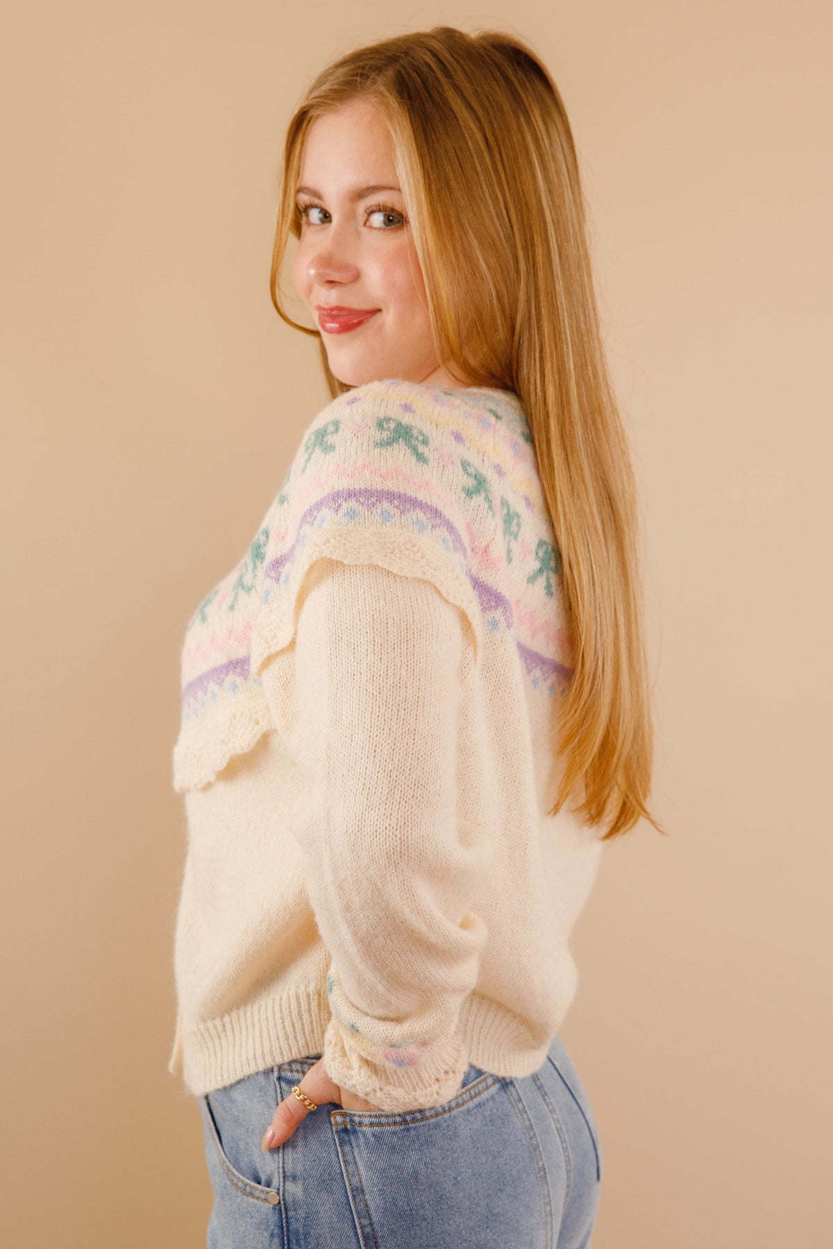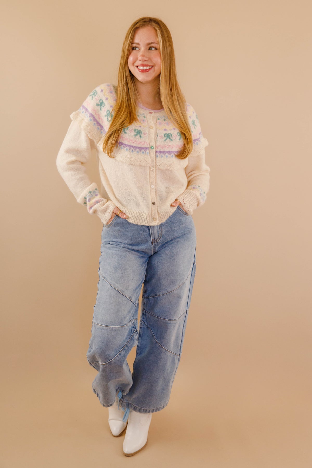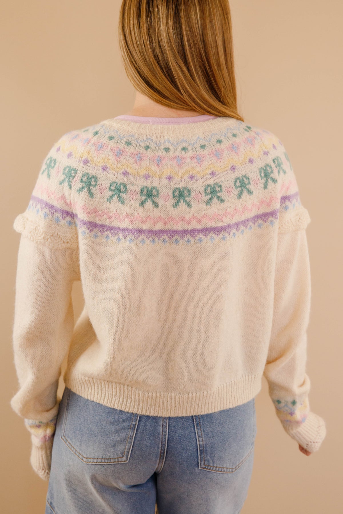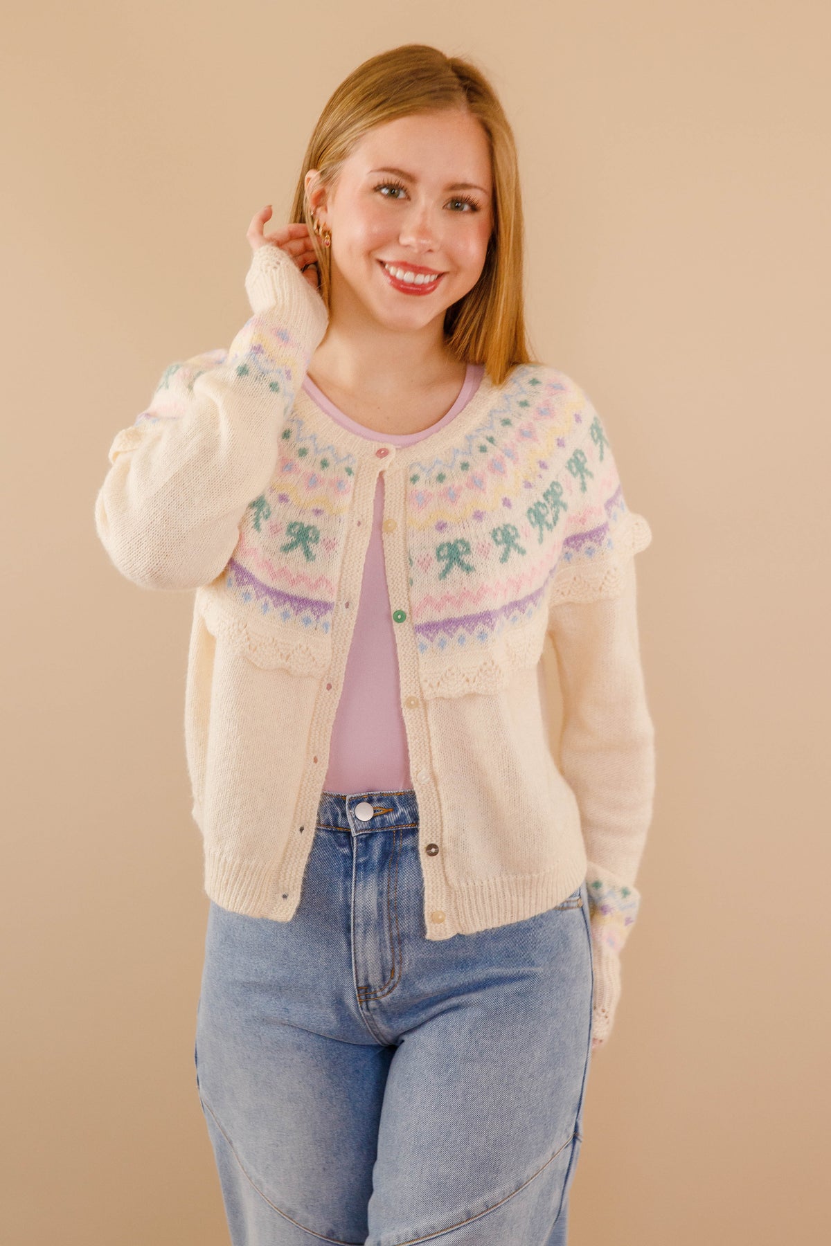 Meet your new favorite layer! This delightful button-front cardigan wraps you in sumptuous ivory knit with a show-stopping Fair Isle yoke that's pure joy. Whimsical bows and cheerful geometric shapes dance across the yoke in dreamy pastels—rosy pink, soft lavender, sunny yellow, and gentle green. A sweet scalloped ruffle frames the design with vintage flair, while charming pastel buttons in different shapes add personality to every closure. The cozy crew neckline and ribbed cuffs tie the whole look together beautifully, making this a piece that's as fun to wear as it is to admire.