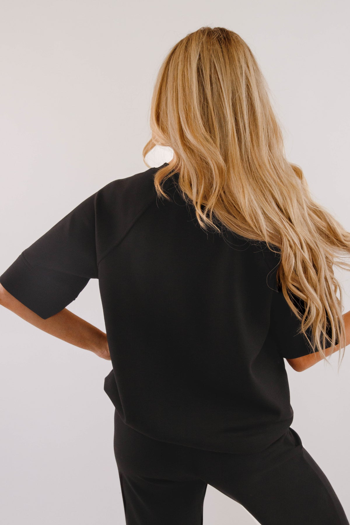 Elevate your everyday wardrobe with this All The Energy Short Sleeve Pullover. Crafted from luxurious scuba fabric, it offers silky smooth comfort and lightweight breathability. The relaxed fit, dropped shoulders, and oversized sleeves create a chic silhouette that moves with you, thanks to 4-way stretch for all-day flexibility. Perfectly combining style and ease, this top adds effortless cool-girl energy to any casual look!
