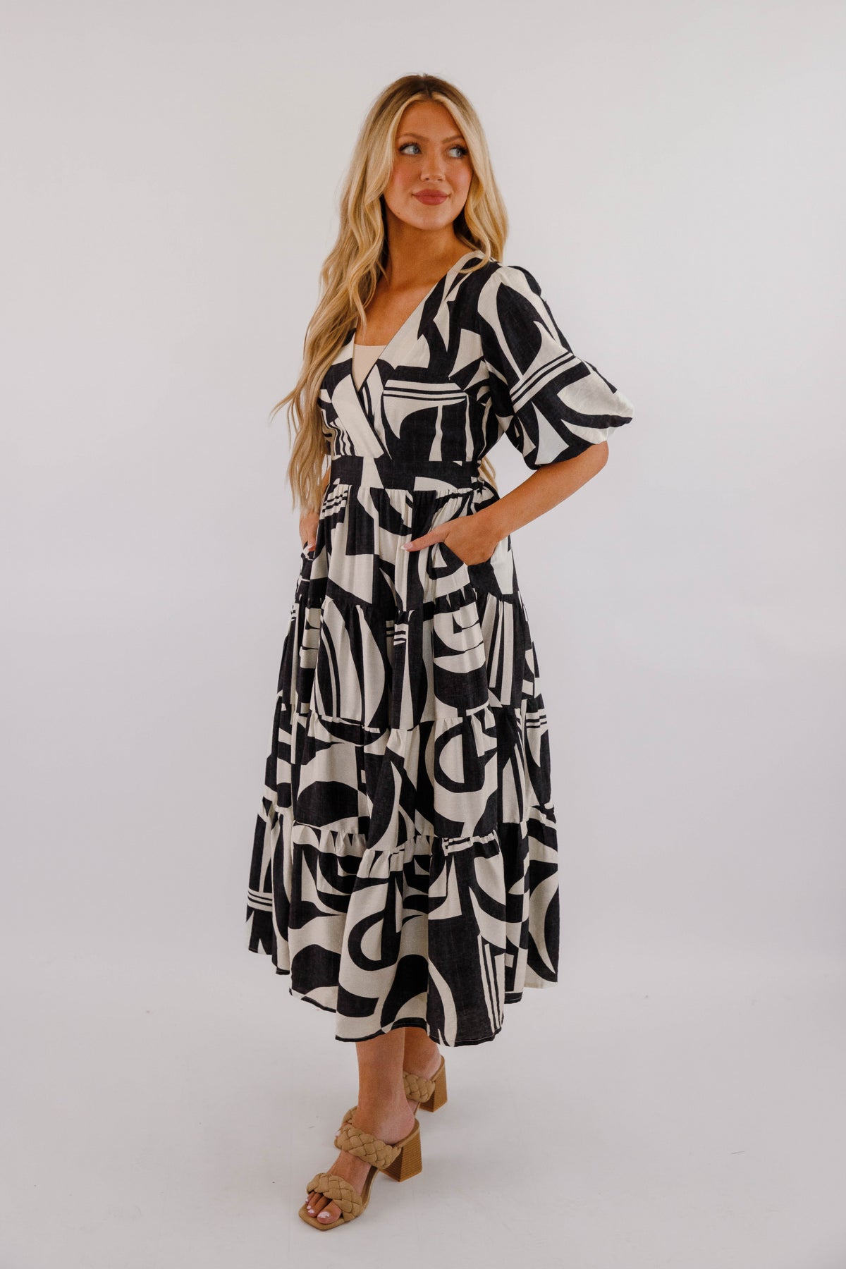 The Made For It Maxi Dress features short puff sleeves and a flattering deep V-neckline, designed to enhance your silhouette with a modern black and white print. Its tiered maxi skirt flows gracefully, while the elastic waistband and self-tie belt provide a comfortable, adjustable fit. Perfect for both everyday wear and special occasions, this dress blends style and ease effortlessly!