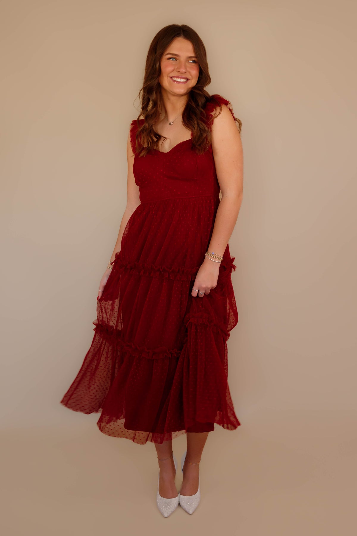 Discover the dress that transforms any occasion into something memorable! This wine swiss dot midi dress combines timeless elegance with modern details that truly stand out. The sweetheart neckline creates an instantly flattering frame, while elastic ruffle straps add playful sophistication. Tiered ruffles cascade down the skirt for graceful movement and visual interest, and the back smocking ensures a personalized, comfortable fit that adapts to your body. From casual gatherings to special celebrations, this versatile piece is the answer to looking polished and put-together effortlessly!