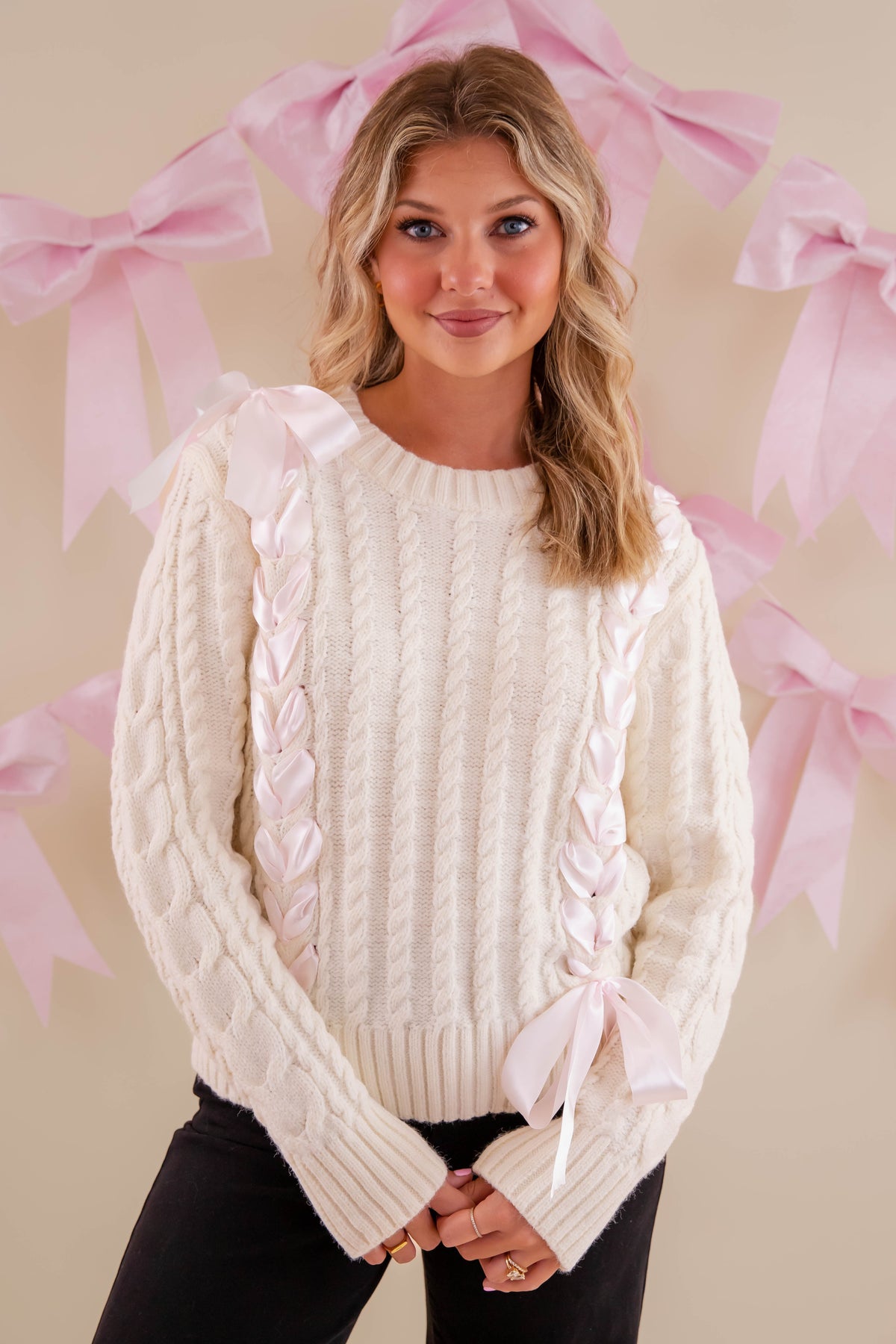 Cozy up in style with our Tied To You Ribbon Sweater. The cable knit provides warmth, while the ribbon threaded bow detail adds a cute and stylish touch. With a round neck, long sleeves, and ribbed neckline, this top is perfect for any girly occasion!