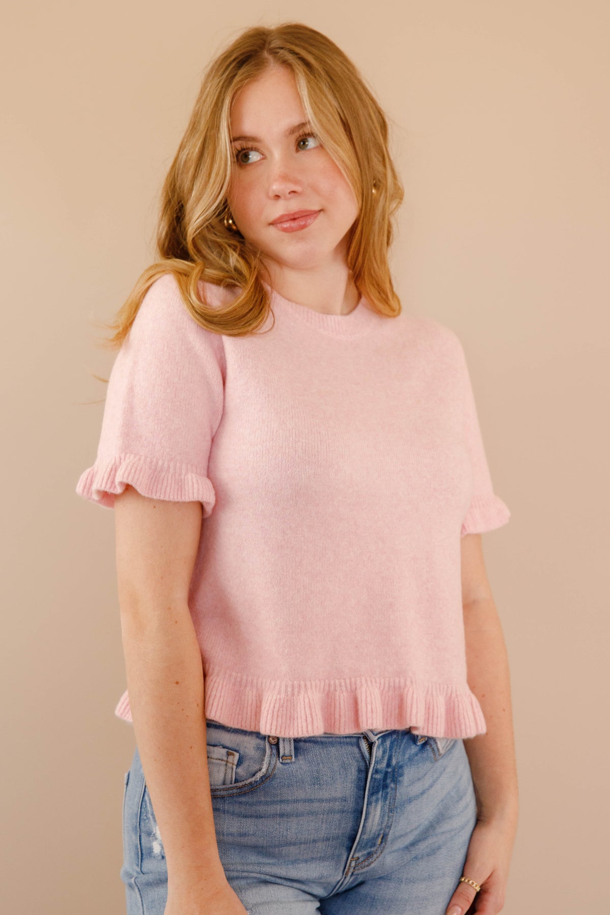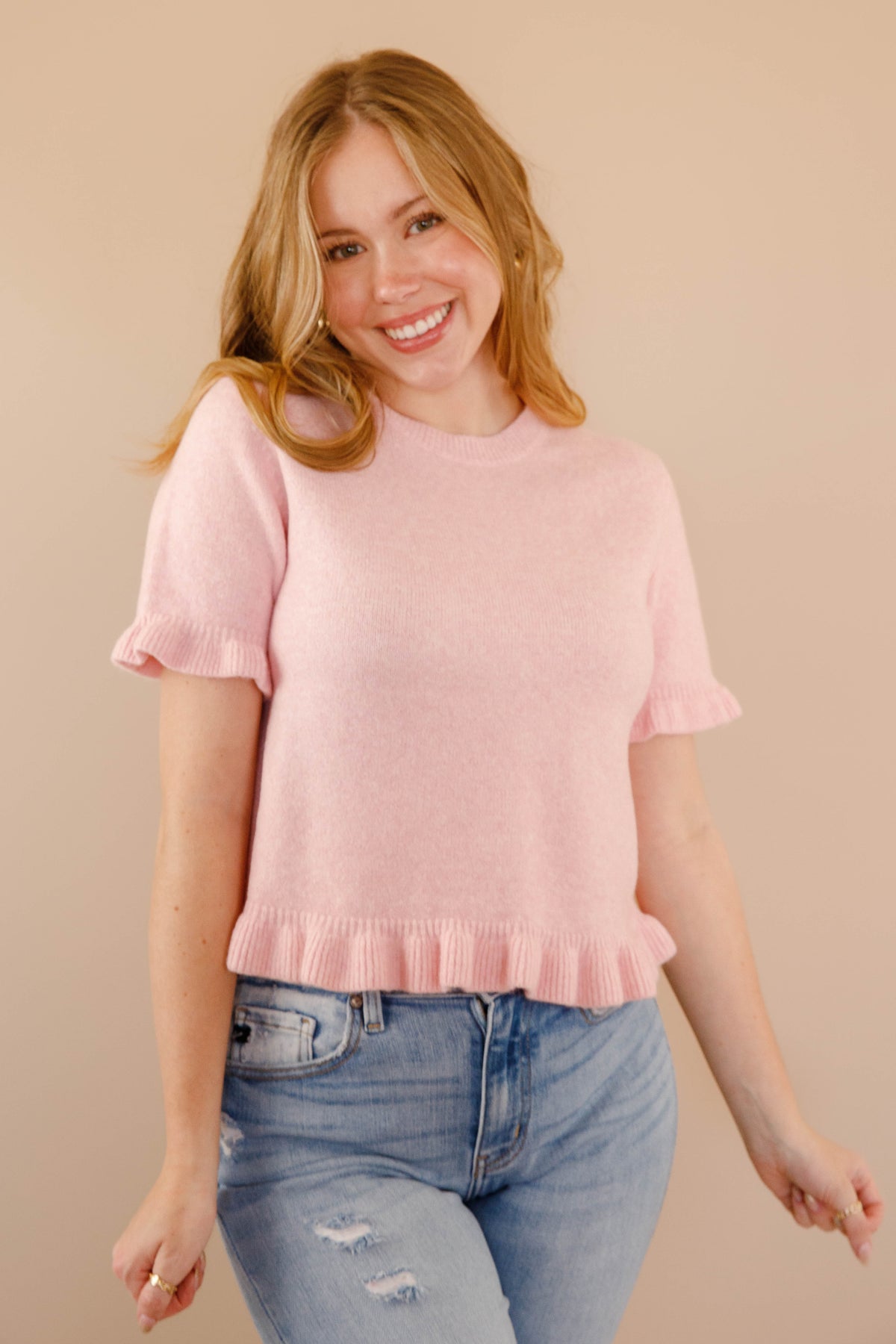 Effortlessly chic and undeniably versatile, this lightweight knit sweater brings understated elegance to your spring wardrobe. The relaxed fit skims the waist while delicate ruffle detailing at the hem and sleeves adds a refined feminine touch. A ribbed crew neckline provides a polished foundation for layering under blazers or styling solo with your favorite denim. Crafted from a soft, gentle fabric that feels as good as it looks, this pullover essential transitions seamlessly from casual days to more composed occasions.