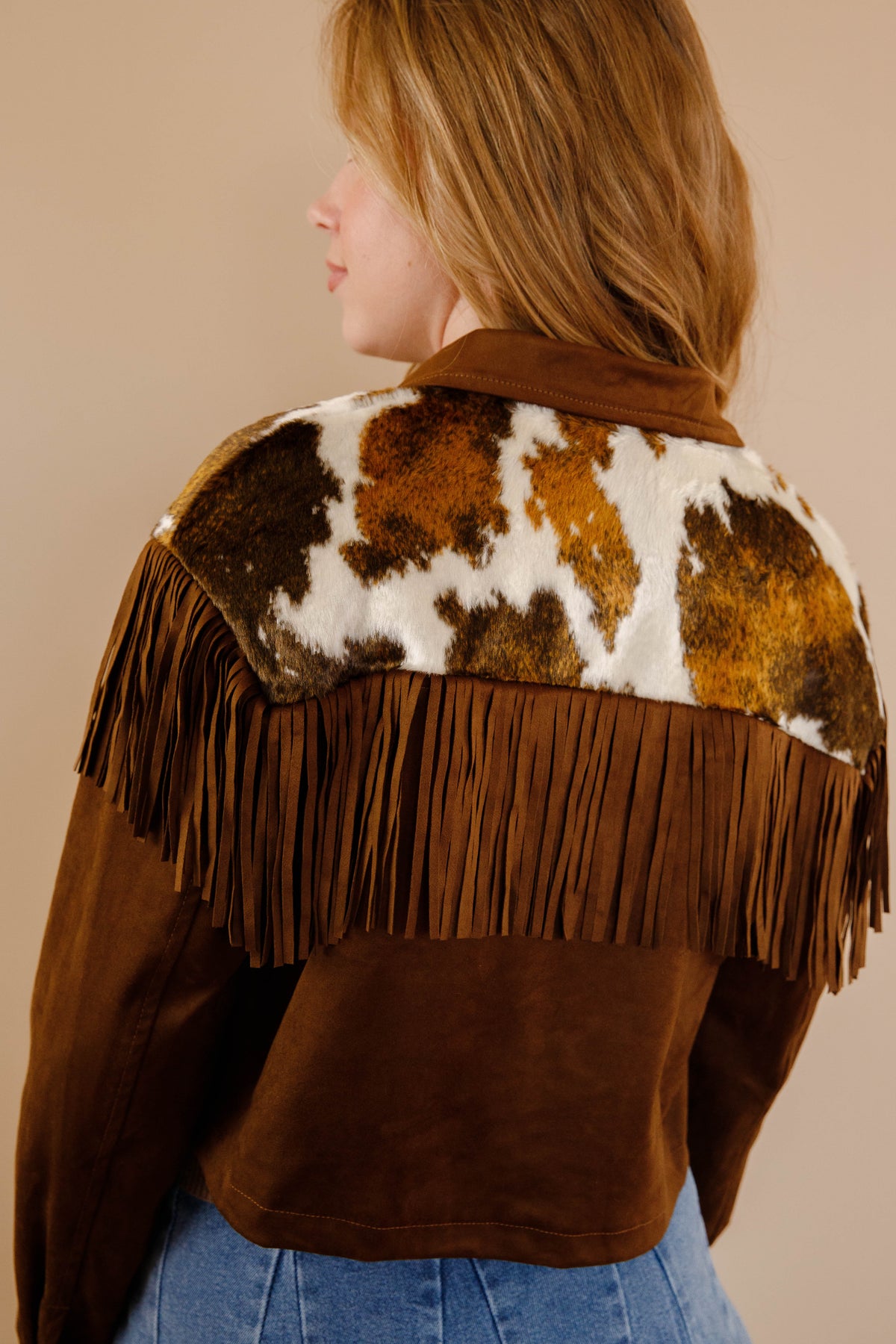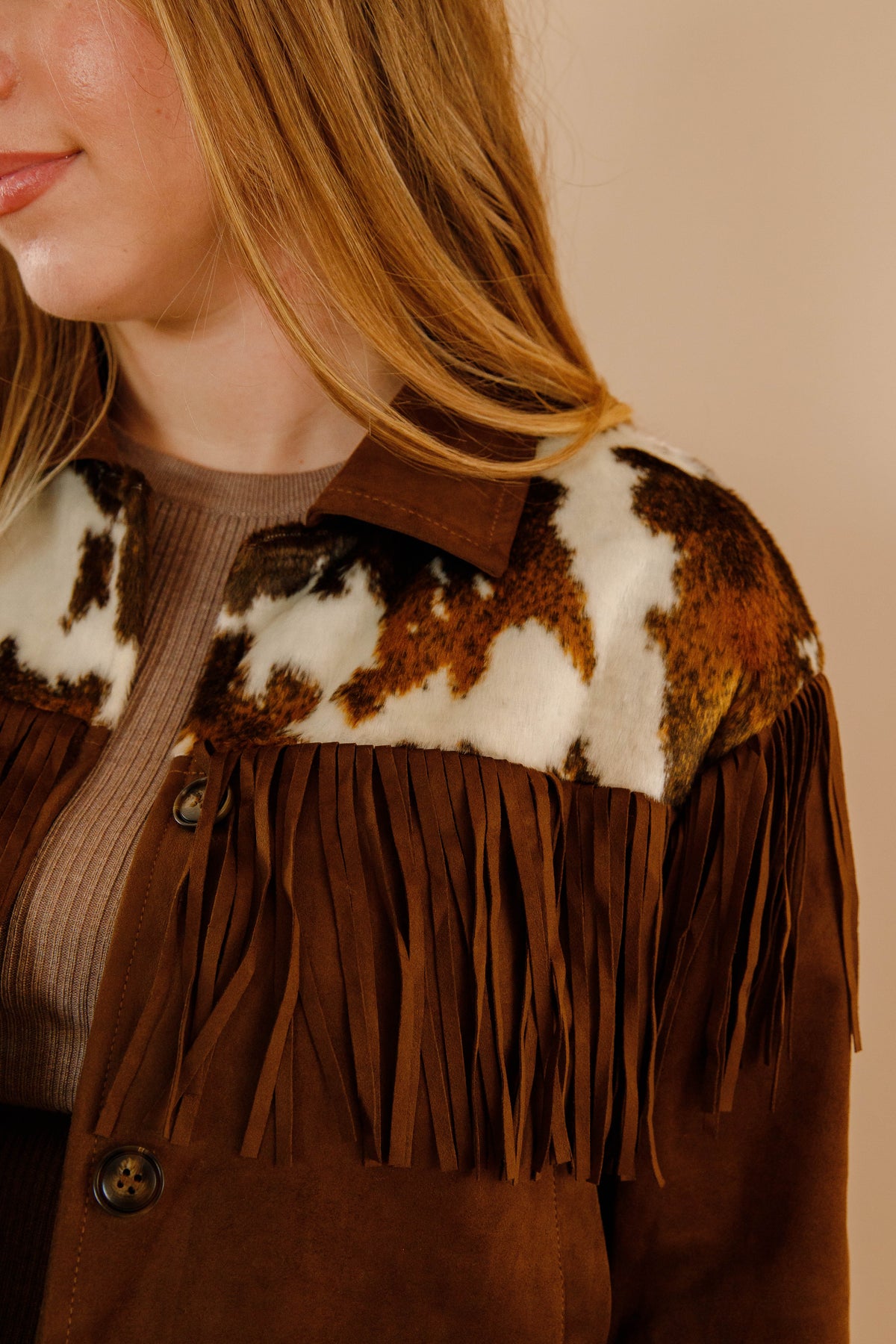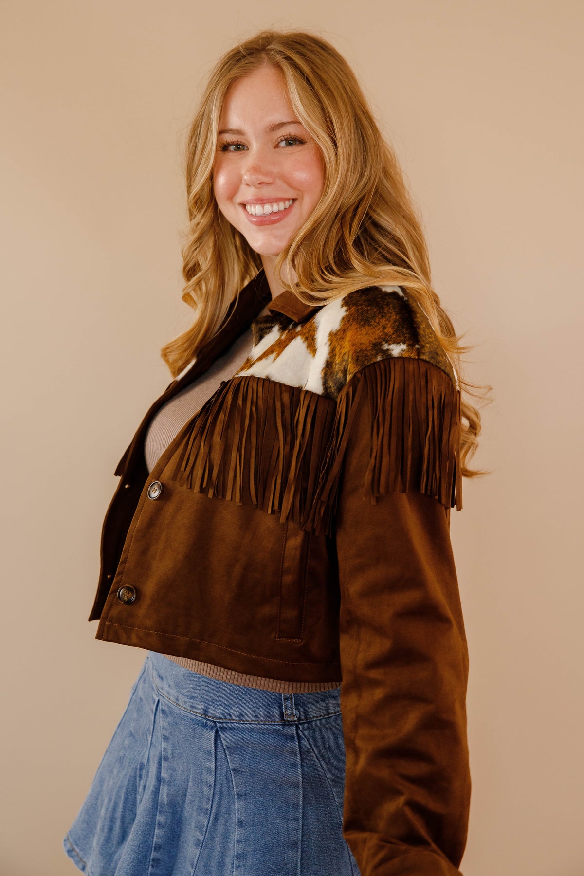 Saddle up for serious style with this brown faux suede jacket that's got all the Western charm without the guilt. The slightly cropped cut hits just right, while cow-hide accents frame the front and back shoulders for that authentic ranch-ready vibe. Fringe details add movement and personality to every step. Button down the front for easy layering over your favorite tees and tanks. Perfect for anyone who wants to channel their inner cowgirl with a modern twist.