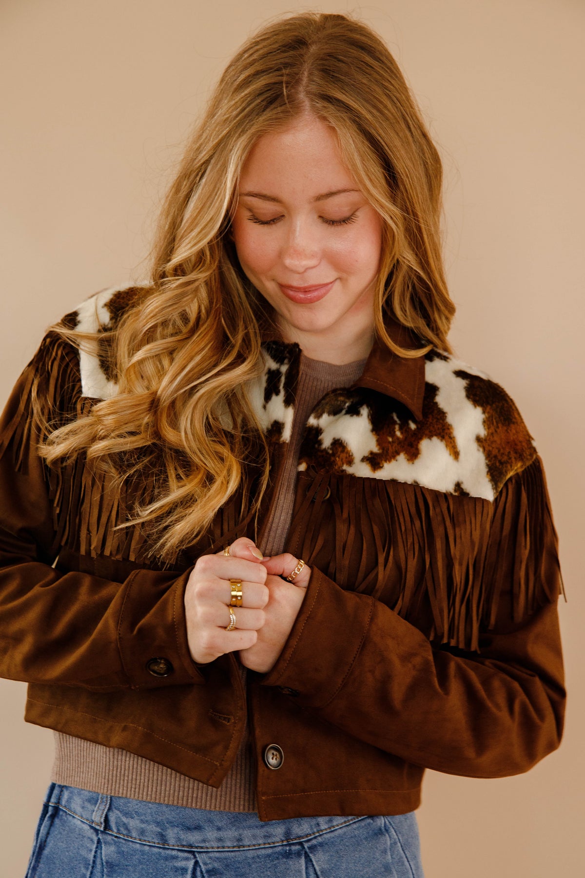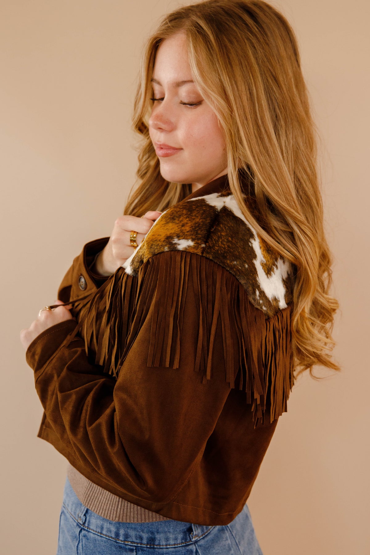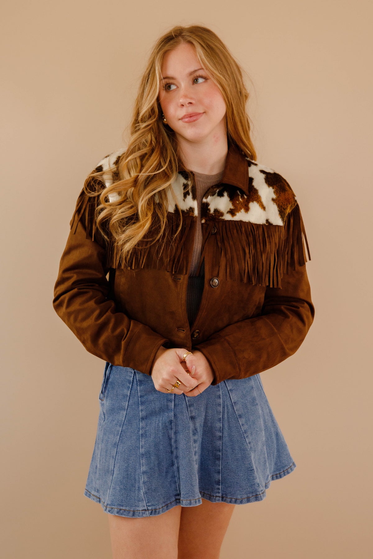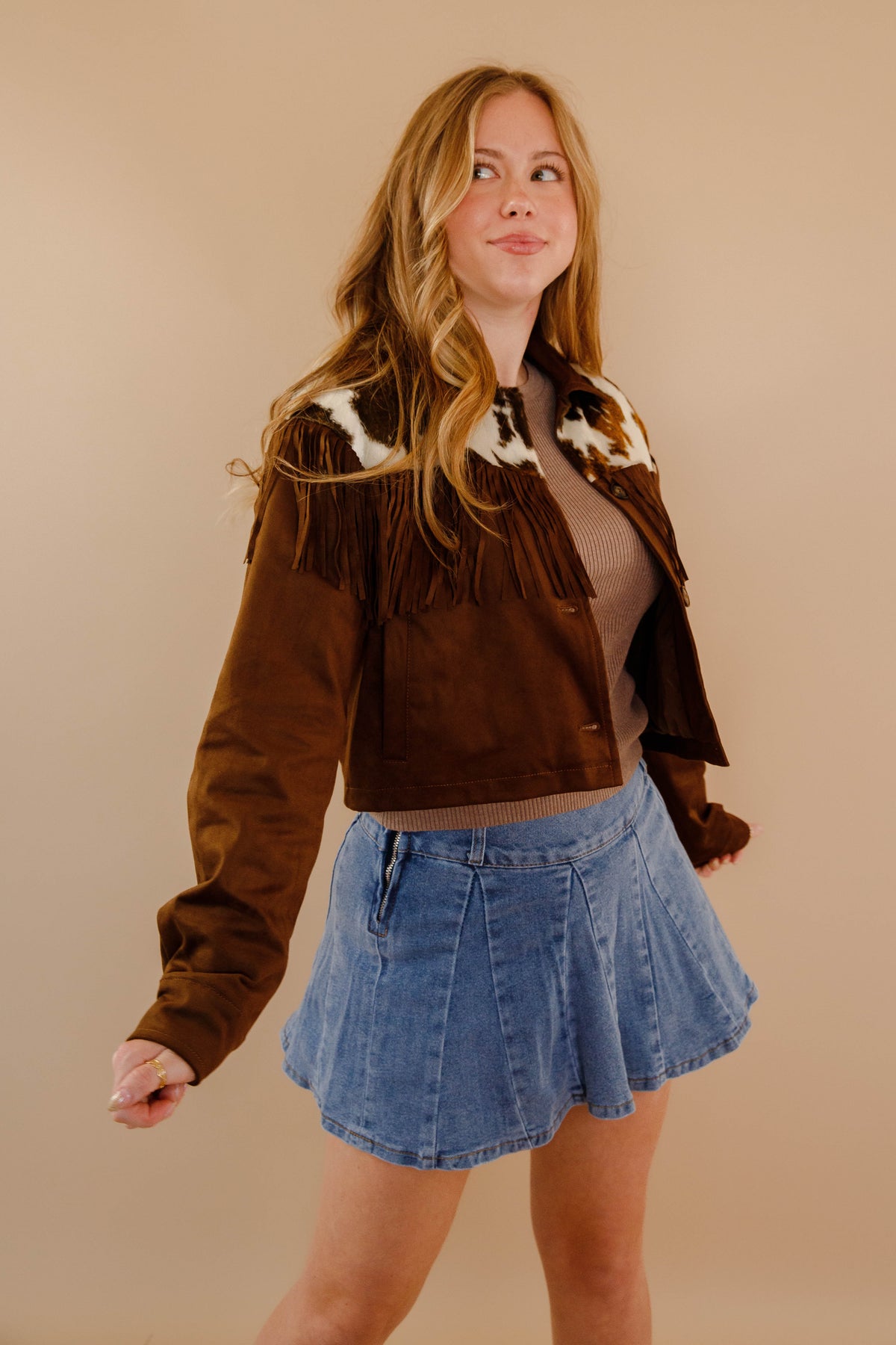 Saddle up for serious style with this brown faux suede jacket that's got all the Western charm without the guilt. The slightly cropped cut hits just right, while cow-hide accents frame the front and back shoulders for that authentic ranch-ready vibe. Fringe details add movement and personality to every step. Button down the front for easy layering over your favorite tees and tanks. Perfect for anyone who wants to channel their inner cowgirl with a modern twist.