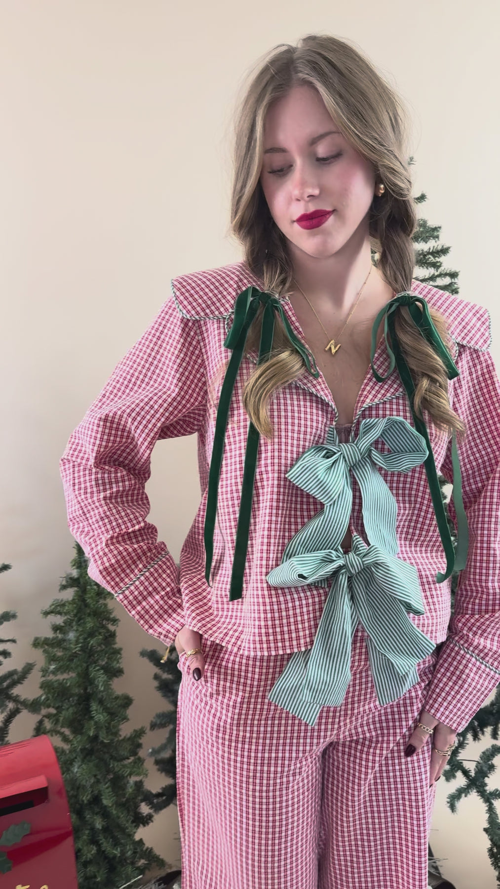 Slip into comfort with this charming gingham pajama top, perfect for cozy nights in. Featuring a classic gingham pattern with eye-catching green contrasting bows, this top combines style with practicality. The open top ties for a customizable fit that moves with you, whether you're winding down after a long day or lounging on weekends. Pair with the matching pants.