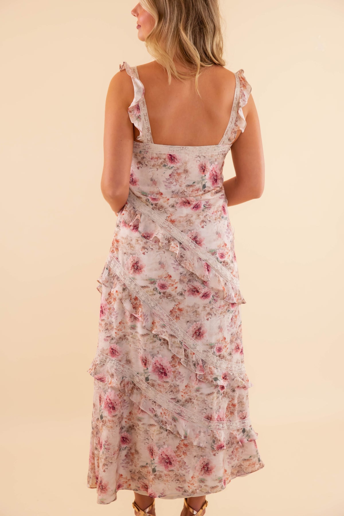 The Good Intentions Maxi Dress captures effortless elegance with its beige base adorned by painterly pink and mauve florals. This relaxed-fit silhouette drapes beautifully with a romantic V-neckline trimmed in delicate lace, while diagonal ruffle tiers and lace insert panels add refined texture throughout. Ruffled shoulder straps provide movement and dimension, creating a soft, feminine aesthetic perfect for any occasion. Finished with a discreet side invisible zipper for seamless styling.