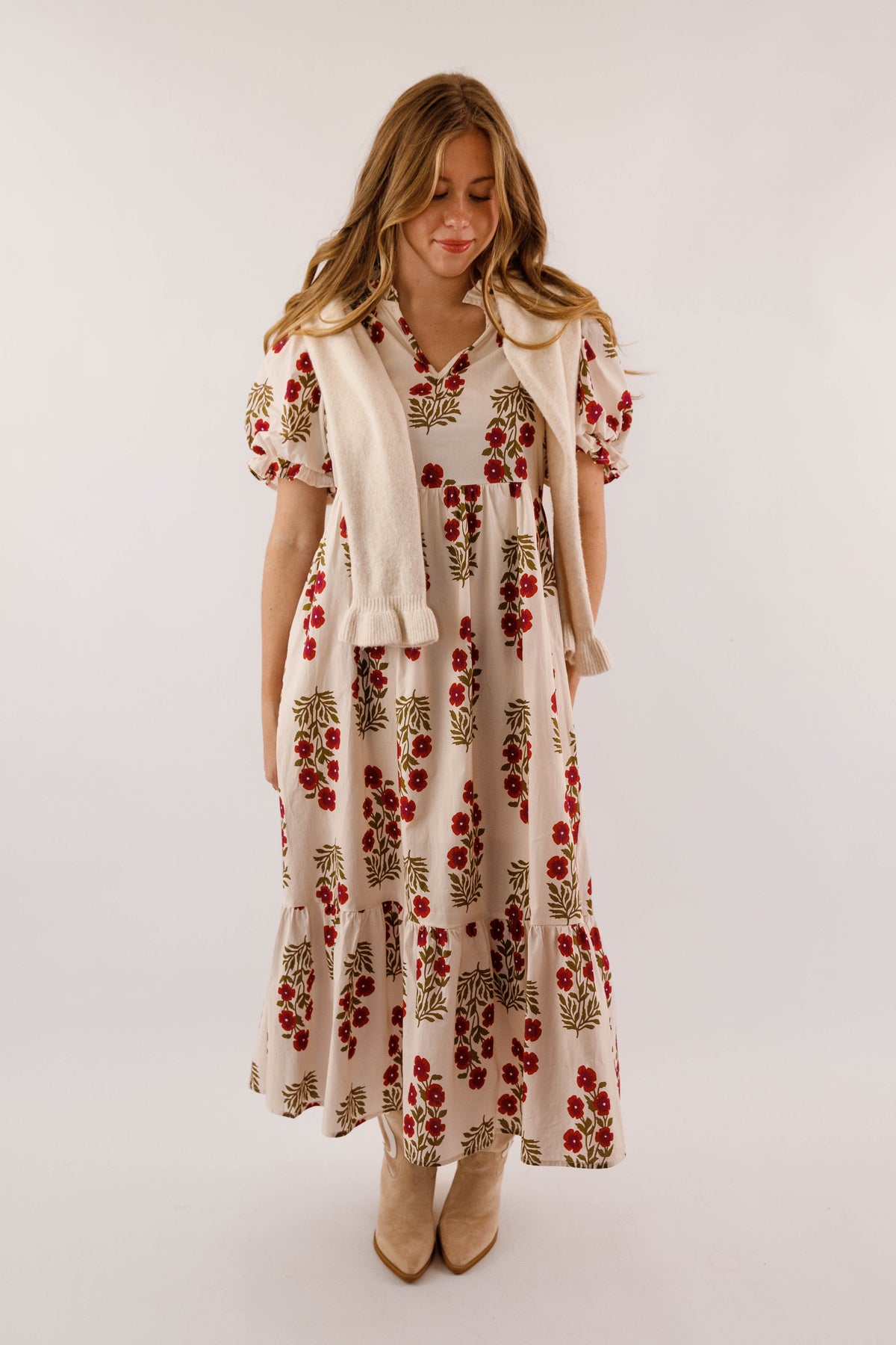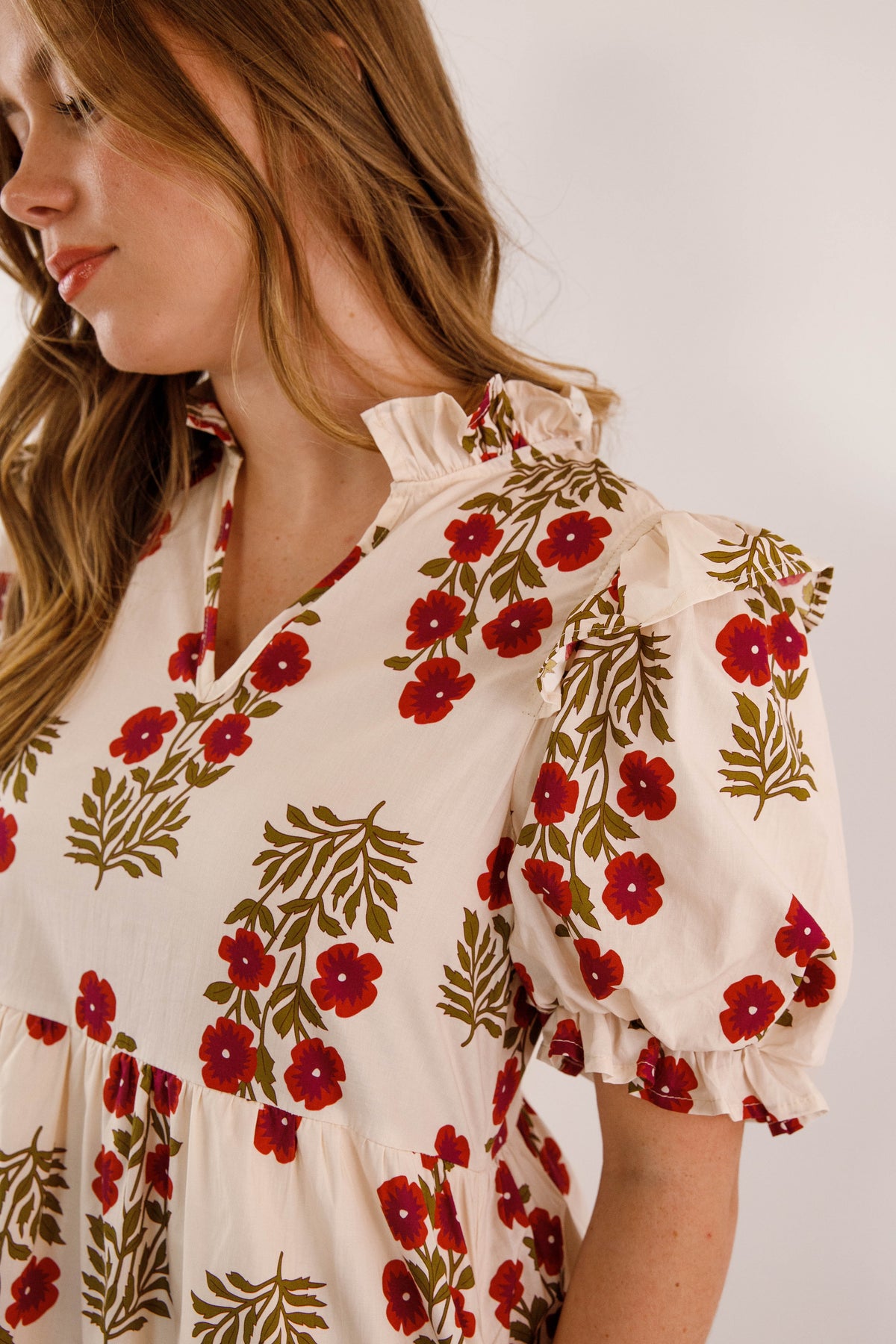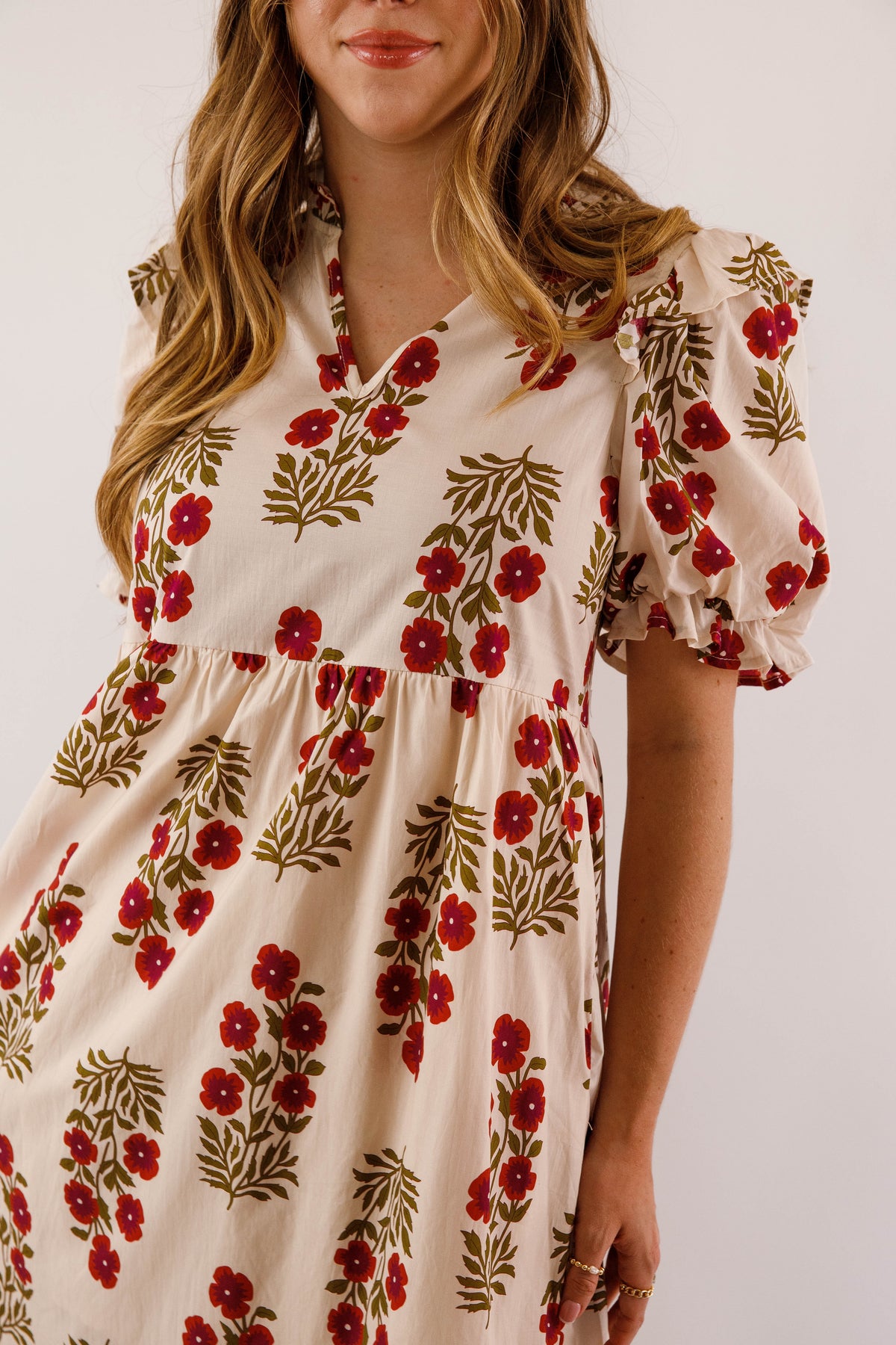 Embrace timeless elegance with this charming midi dress, featuring a delicate floral design against a soft cream backdrop. Adorable ruffle accents frame the collar and hem, while voluminous puff sleeves with elastic ruffle-trimmed cuffs deliver that coveted preppy aesthetic. The gracefully flowing silhouette drapes beautifully, and functional side pockets make this dress as practical as it is pretty. Perfect for elevating your everyday style with feminine sophistication!