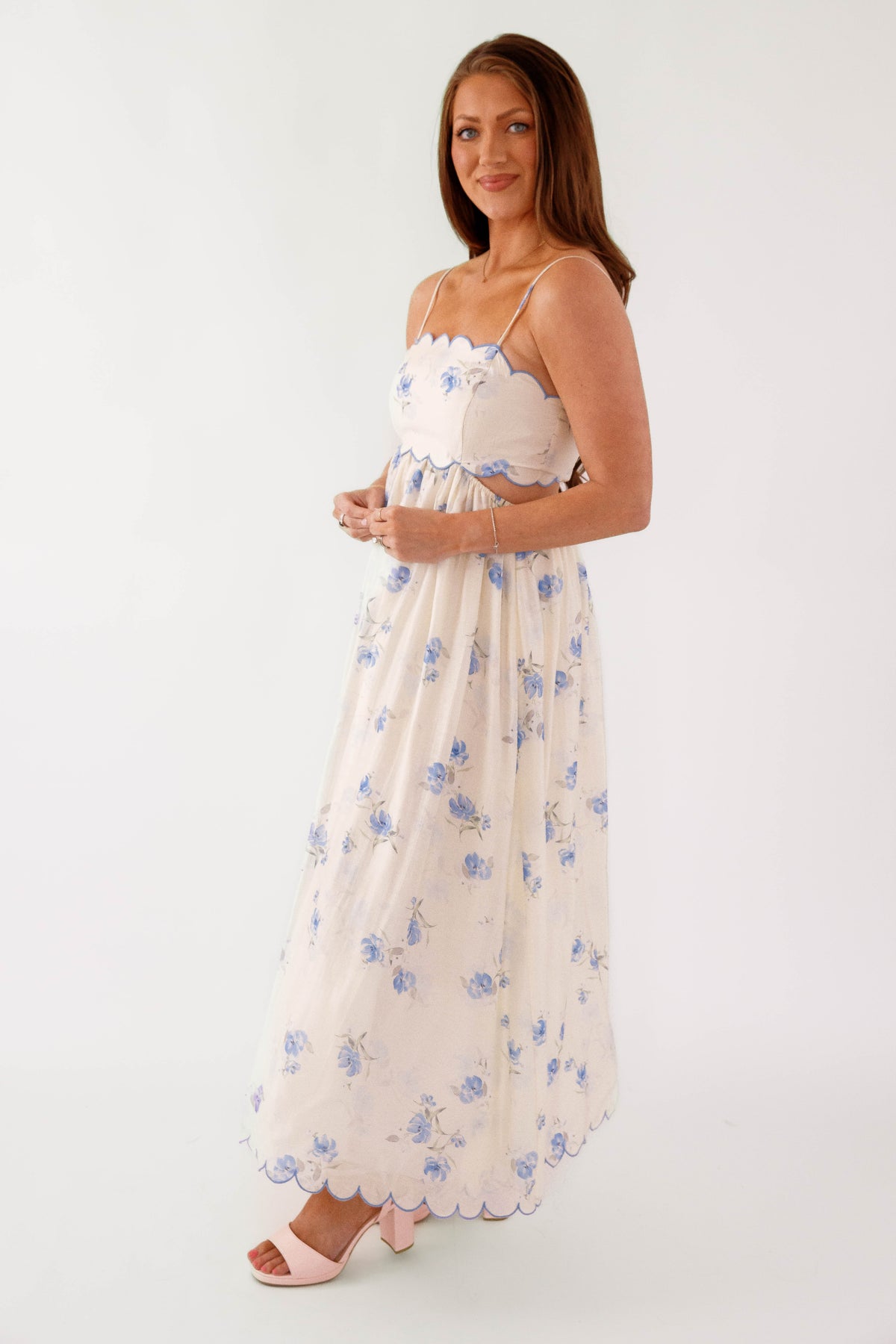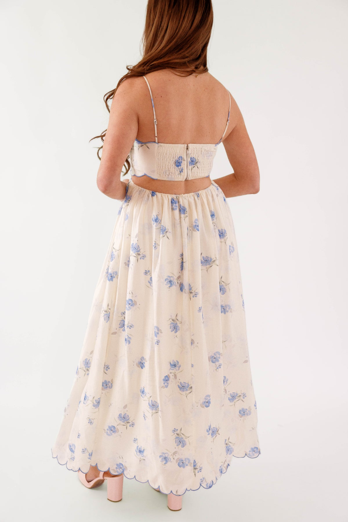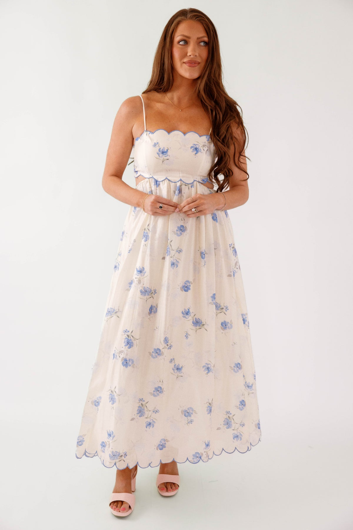 Blue Floral Scalloped Maxi Dress- Cut Out Back Maxi Dress with Scallops- Mable Scalloped Cut Out Maxi