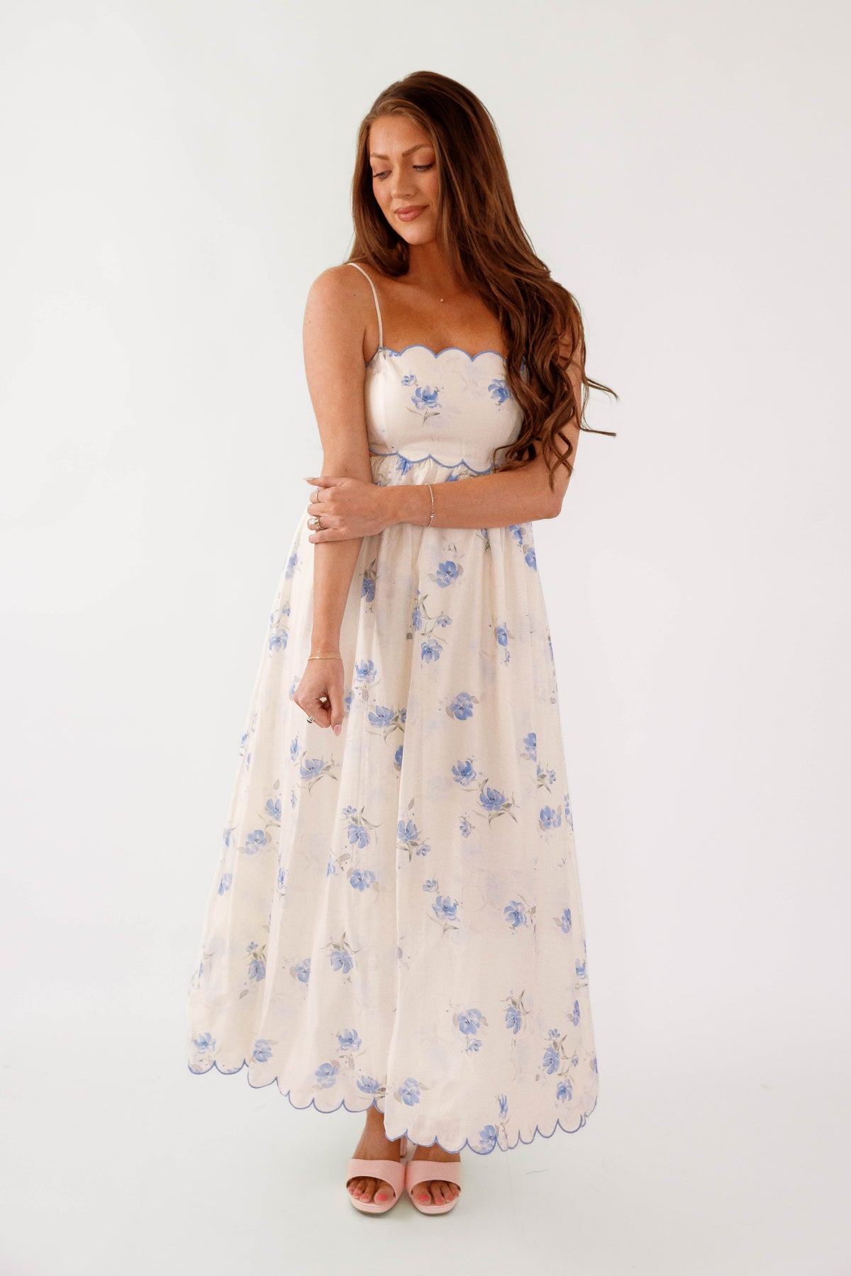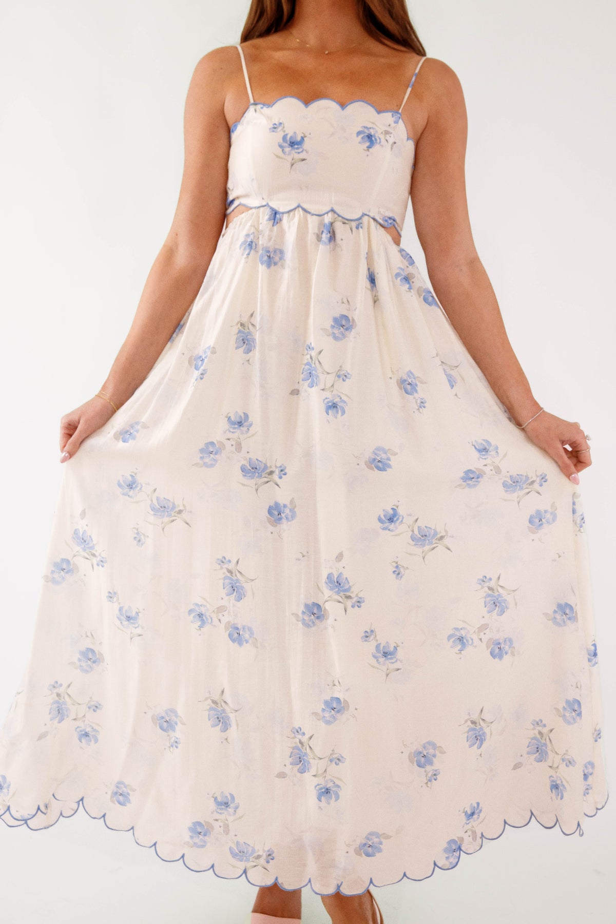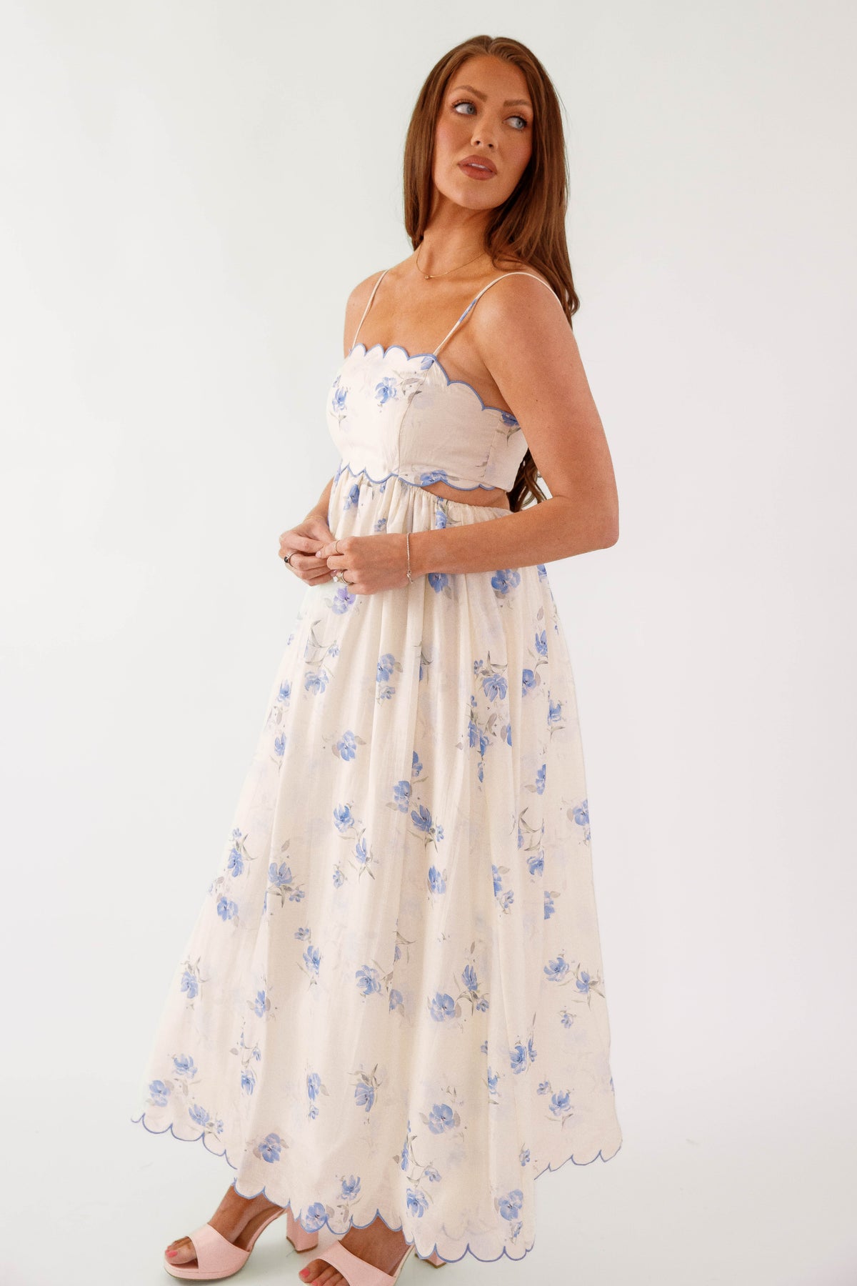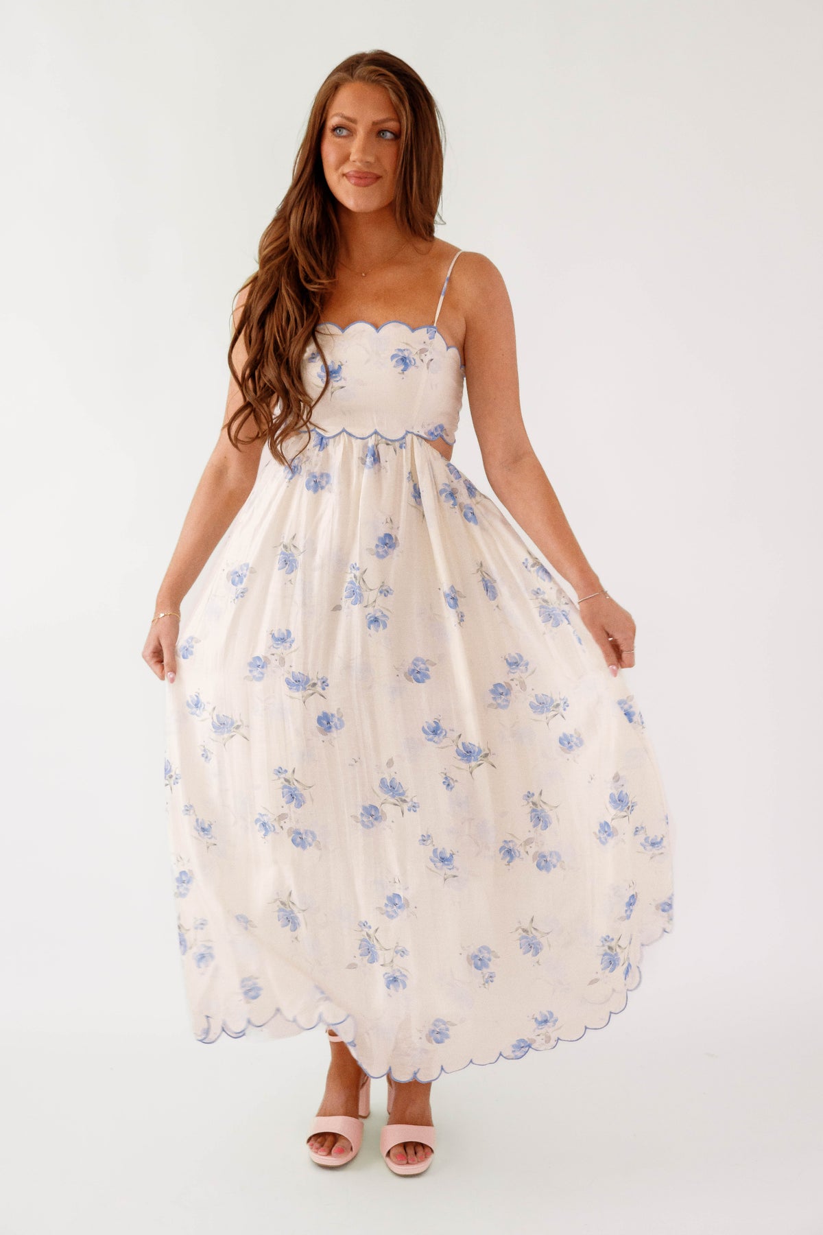 Blue Floral Scalloped Maxi Dress- Cut Out Back Maxi Dress with Scallops- Mable Scalloped Cut Out Maxi