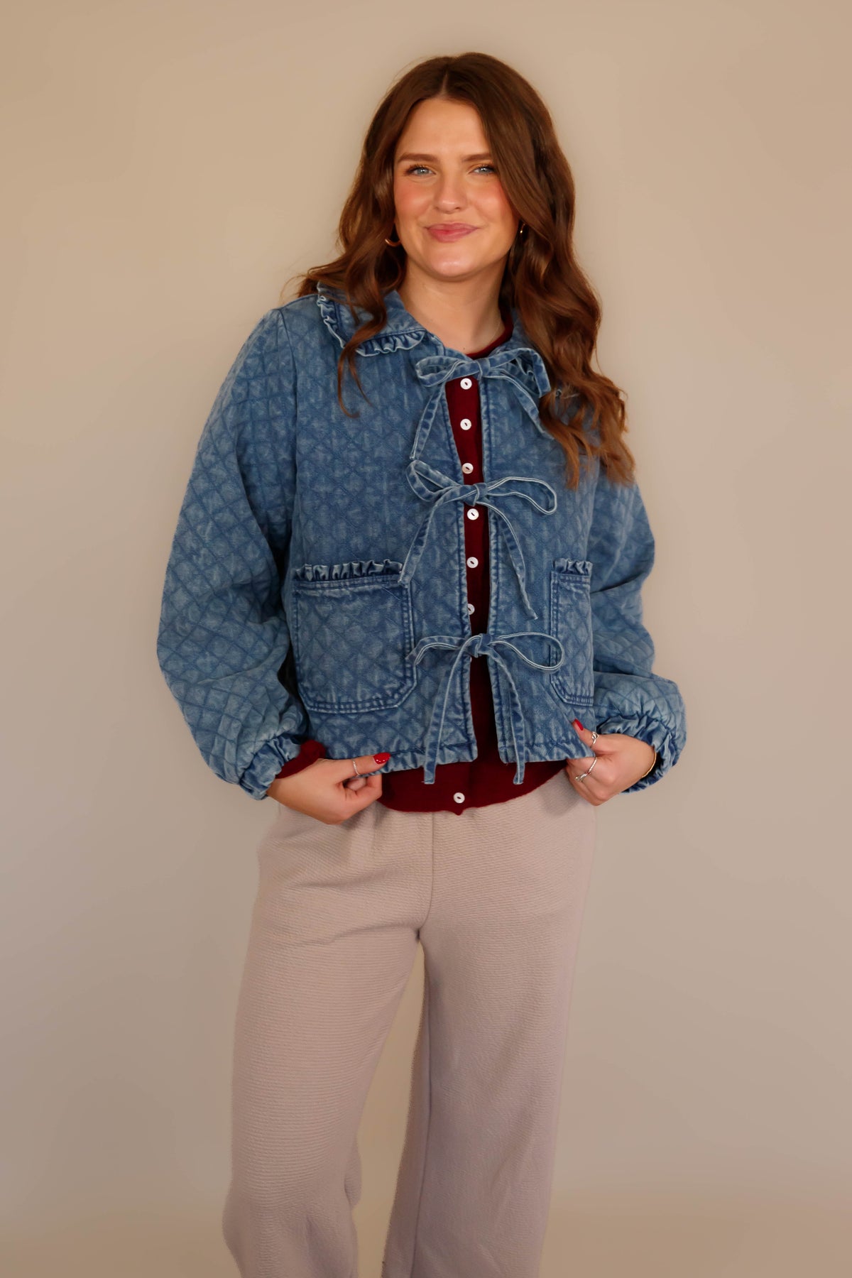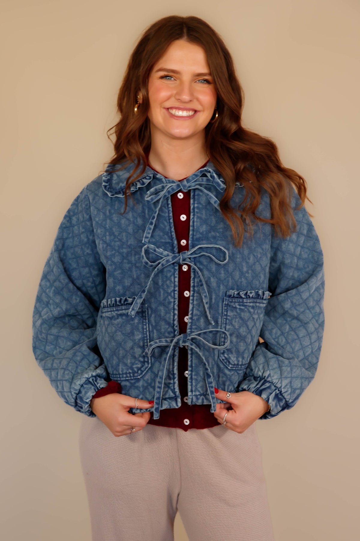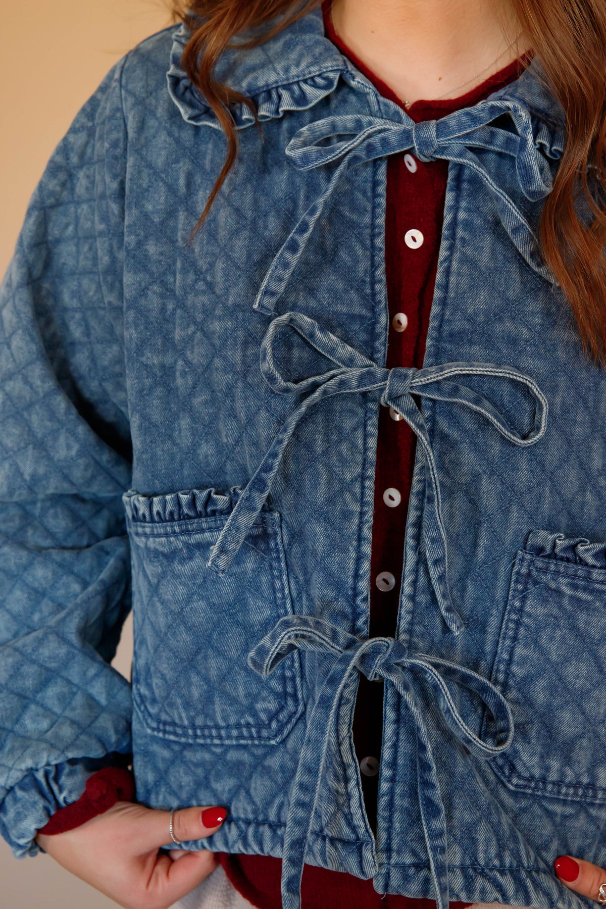 Make a statement with this charming denim coat designed for those who refuse to blend in! The structured collar frames your face beautifully, while playful ruffle trim and a front tie strap inject personality into every wear. Quilted detailing adds dimension and subtle warmth, perfectly complemented by the vintage-inspired washed denim finish. Elastic cuffs provide a secure, comfortable fit that moves with you, and strategically placed pockets keep your essentials within reach. This isn't just outerwear—it's your secret weapon for looking polished and put-together, whether you're heading to brunch or running weekend errands. Versatile enough to pair with anything in your closet, this coat transforms ordinary days into moments worth capturing!