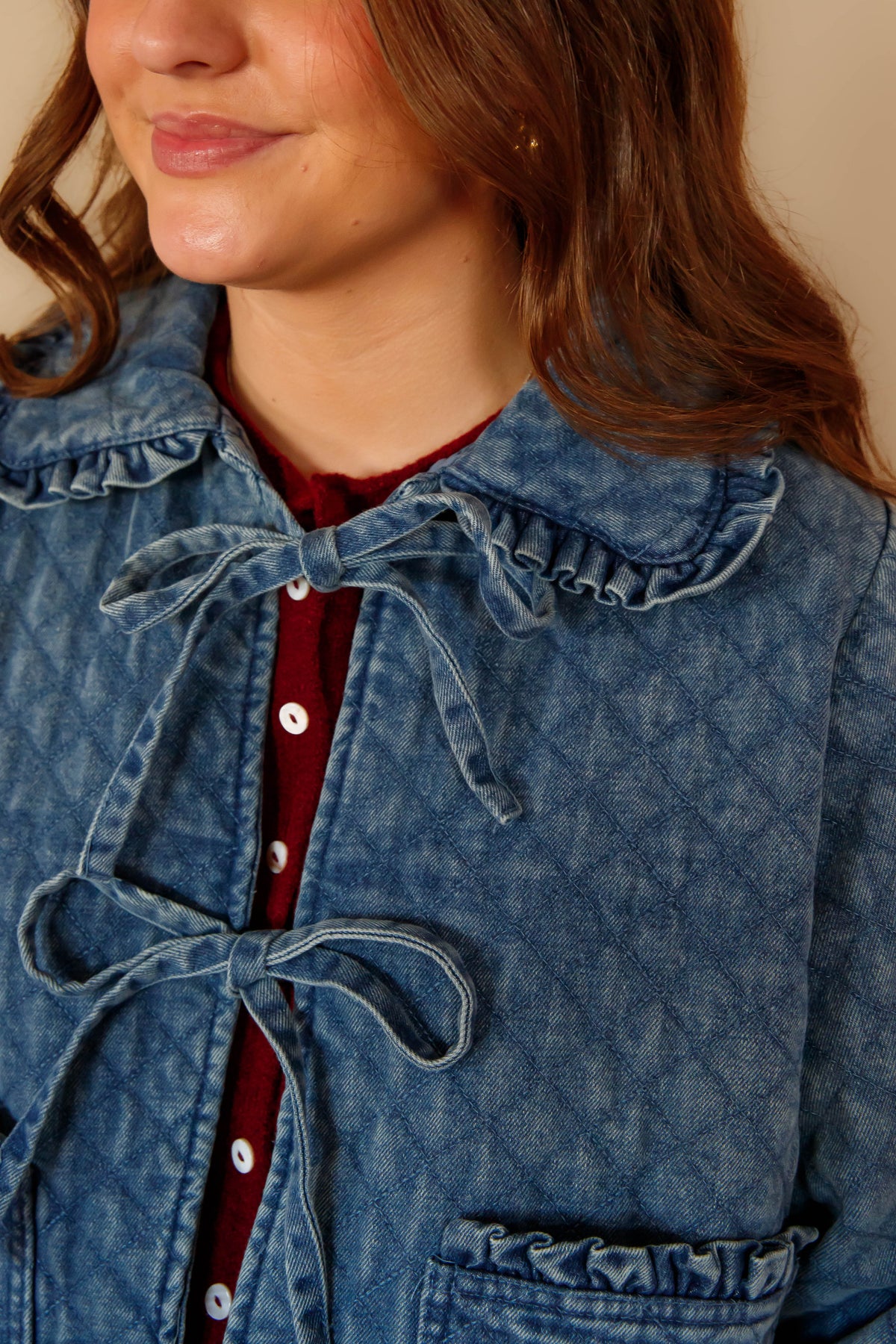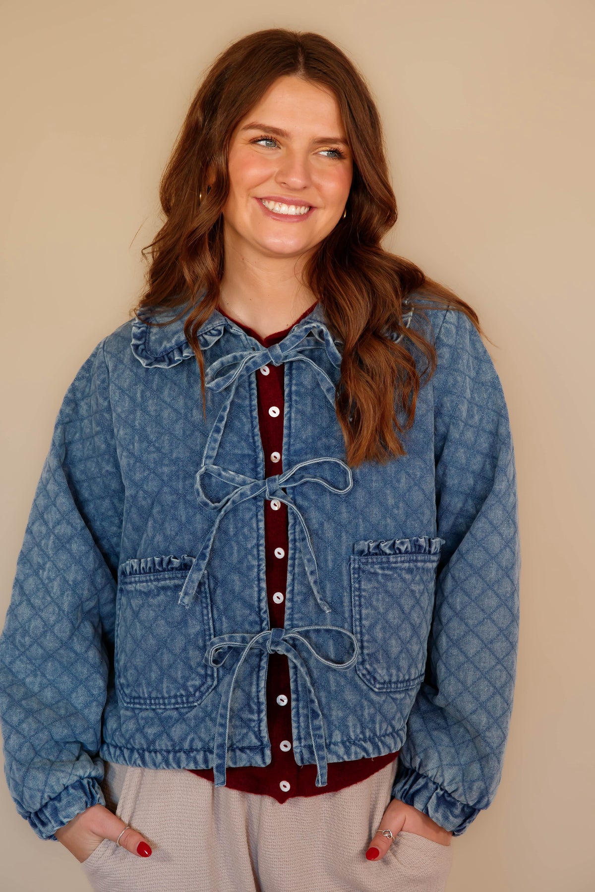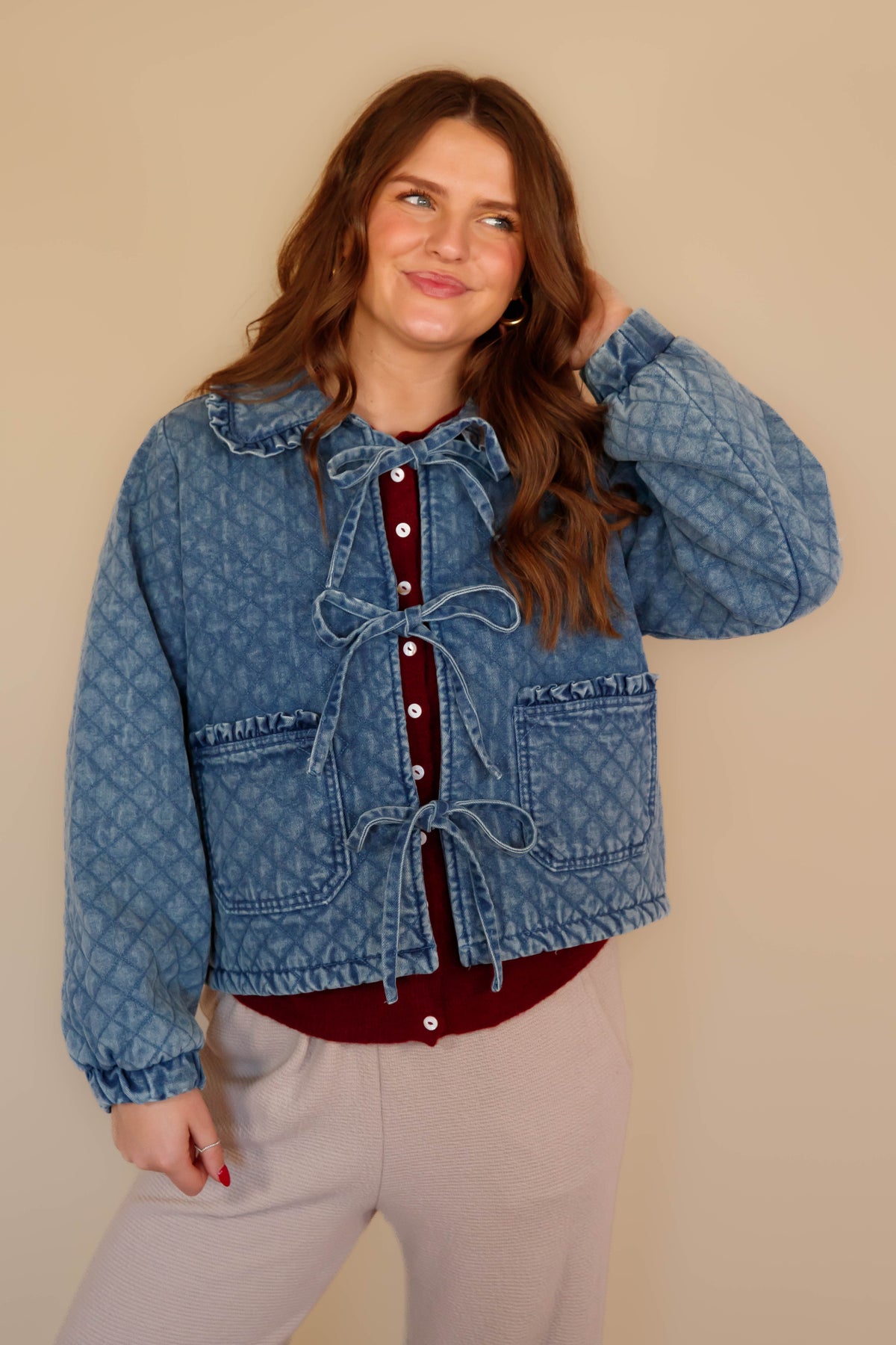 Make a statement with this charming denim coat designed for those who refuse to blend in! The structured collar frames your face beautifully, while playful ruffle trim and a front tie strap inject personality into every wear. Quilted detailing adds dimension and subtle warmth, perfectly complemented by the vintage-inspired washed denim finish. Elastic cuffs provide a secure, comfortable fit that moves with you, and strategically placed pockets keep your essentials within reach. This isn't just outerwear—it's your secret weapon for looking polished and put-together, whether you're heading to brunch or running weekend errands. Versatile enough to pair with anything in your closet, this coat transforms ordinary days into moments worth capturing!