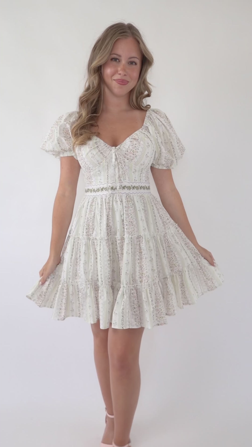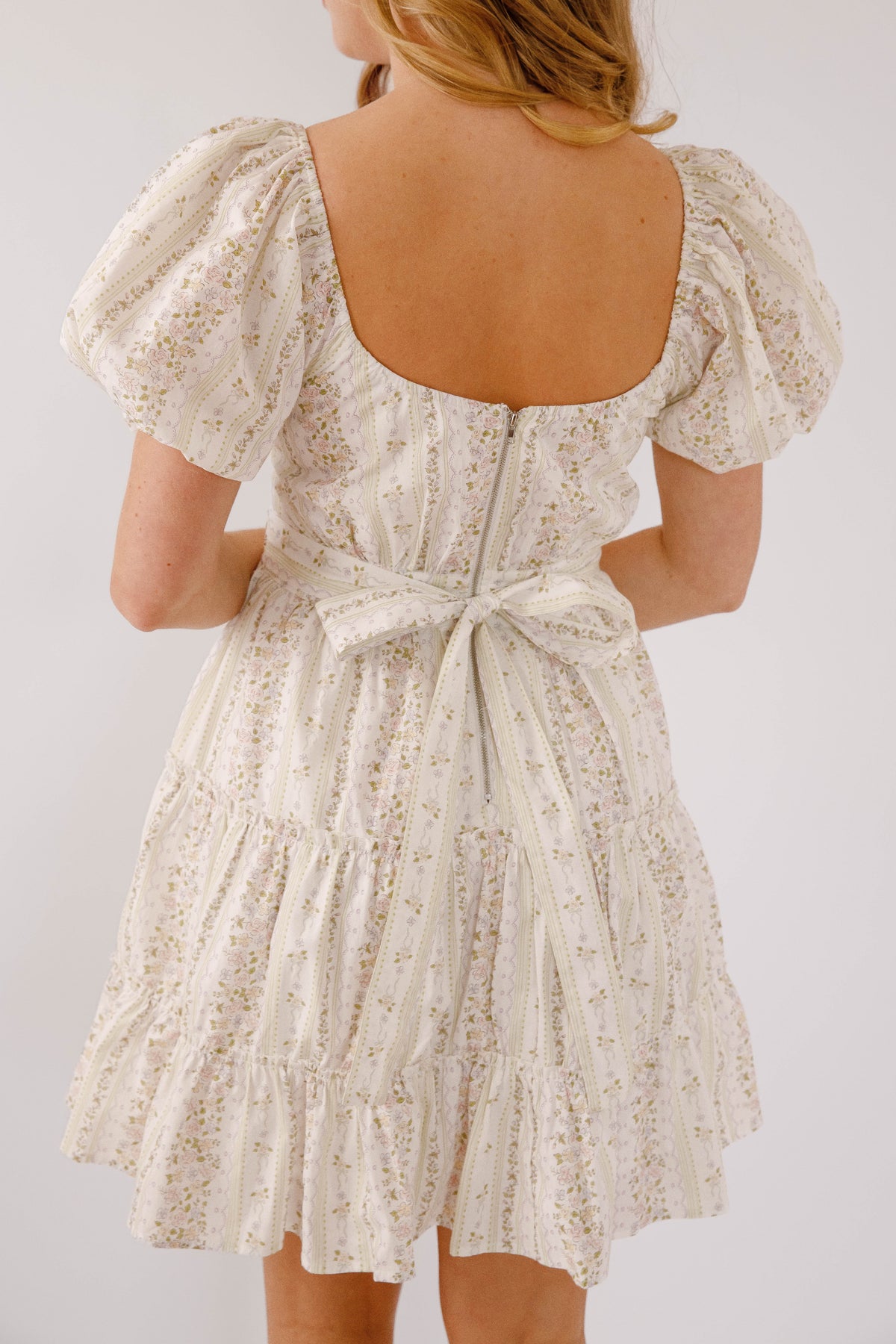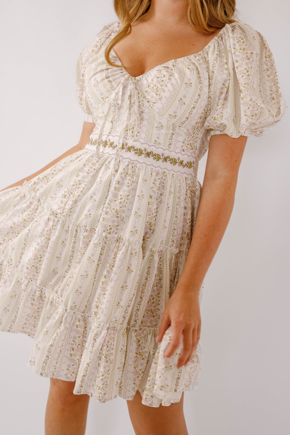 Elevate your style with our Charm Your Way Dress! Featuring a beautiful floral print, short puff sleeves, and an embroidered waist with a tiered hem. This mini dress will charm your way into any occasion. The front bow tie waistband adds a touch of elegance, while the exposed back zipper, synched chest, and self-tie detail make for a perfect fit. Get ready to turn heads and feel confident in our dress!