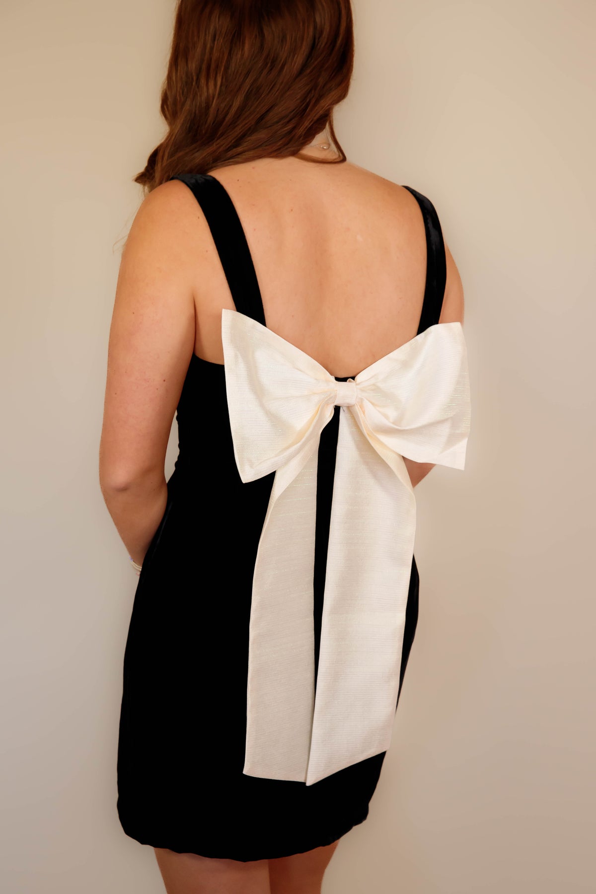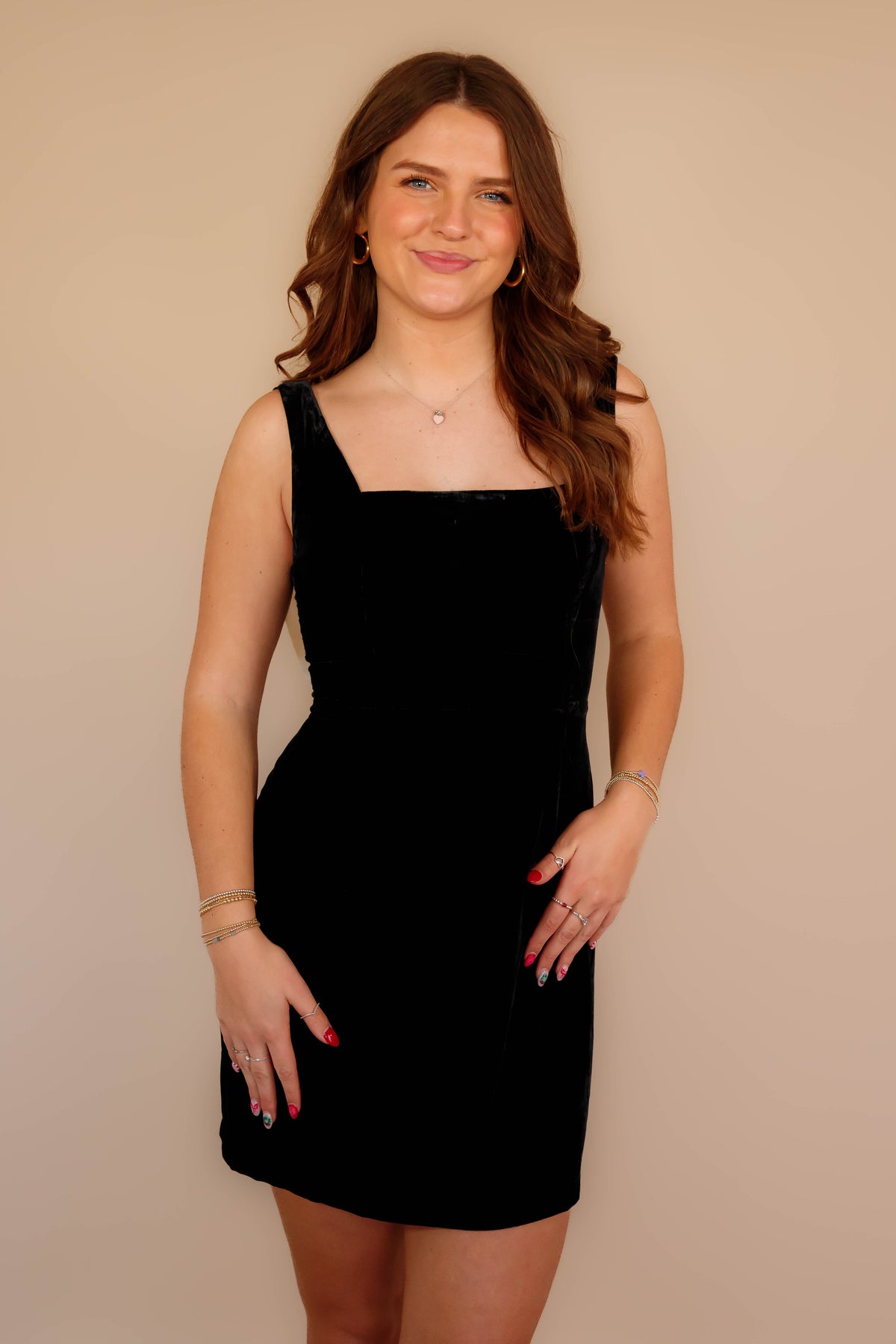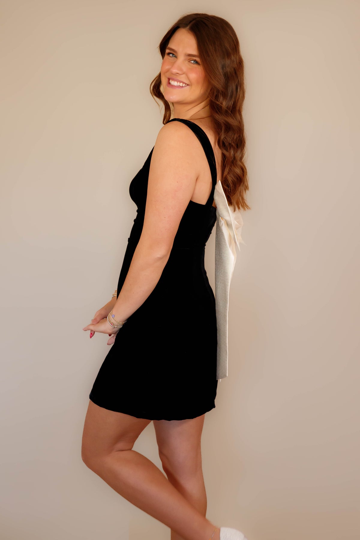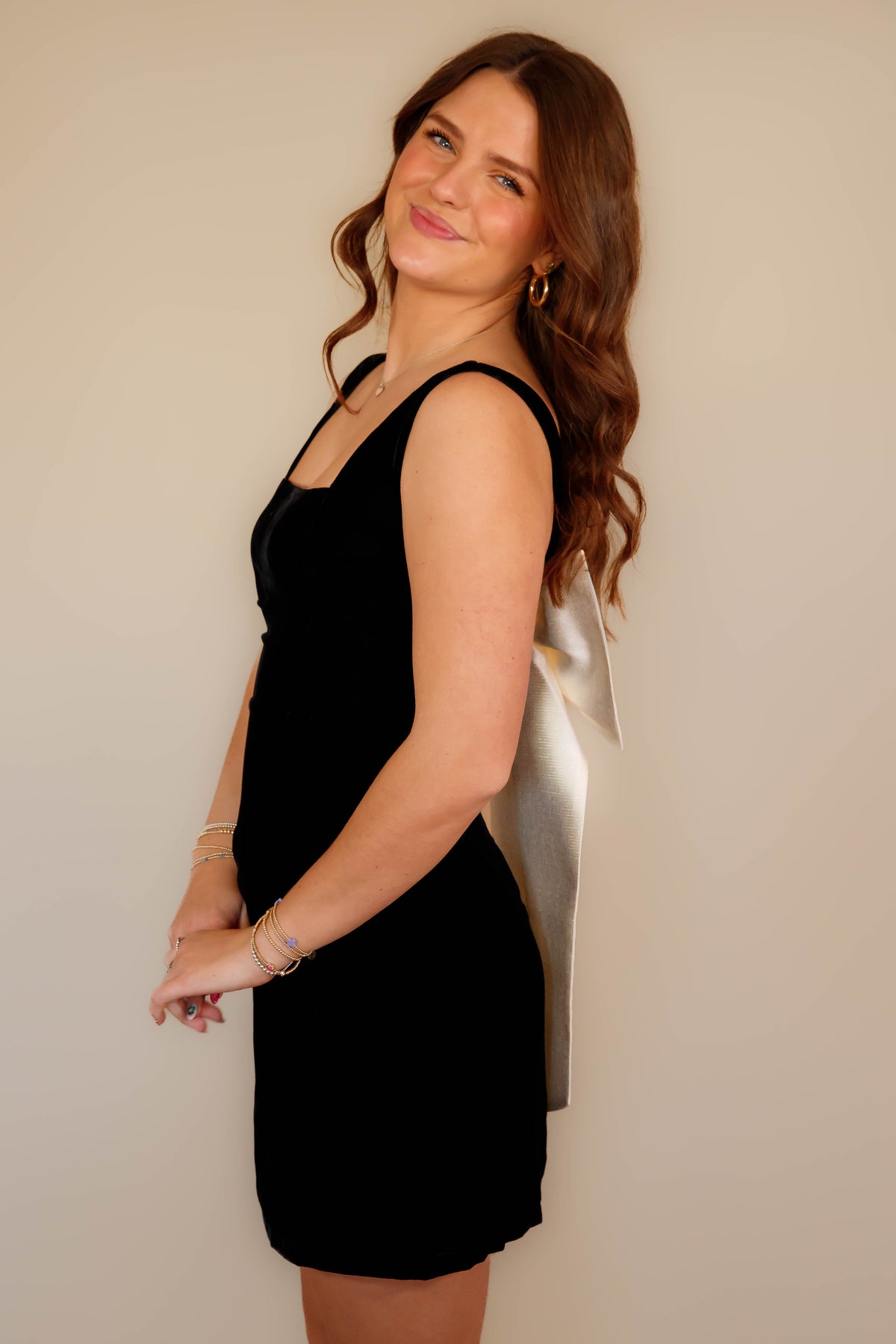 Make an unforgettable entrance in this exquisite velvet mini dress! The sumptuous velvet fabric feels as luxurious as it looks, while the square neckline frames your shoulders with timeless elegance. Sleeveless styling offers versatility—layer it with a blazer for sophistication or wear it bare for bold confidence. The real showstopper? A striking contrast bow detail adorning the back, ensuring you'll turn heads from every angle. In classic black, this dress transitions seamlessly from holiday parties to weekend celebrations. Whether you're dressing up for a special night out or want to feel extraordinary, this piece delivers the polish and personality that sets you apart!
