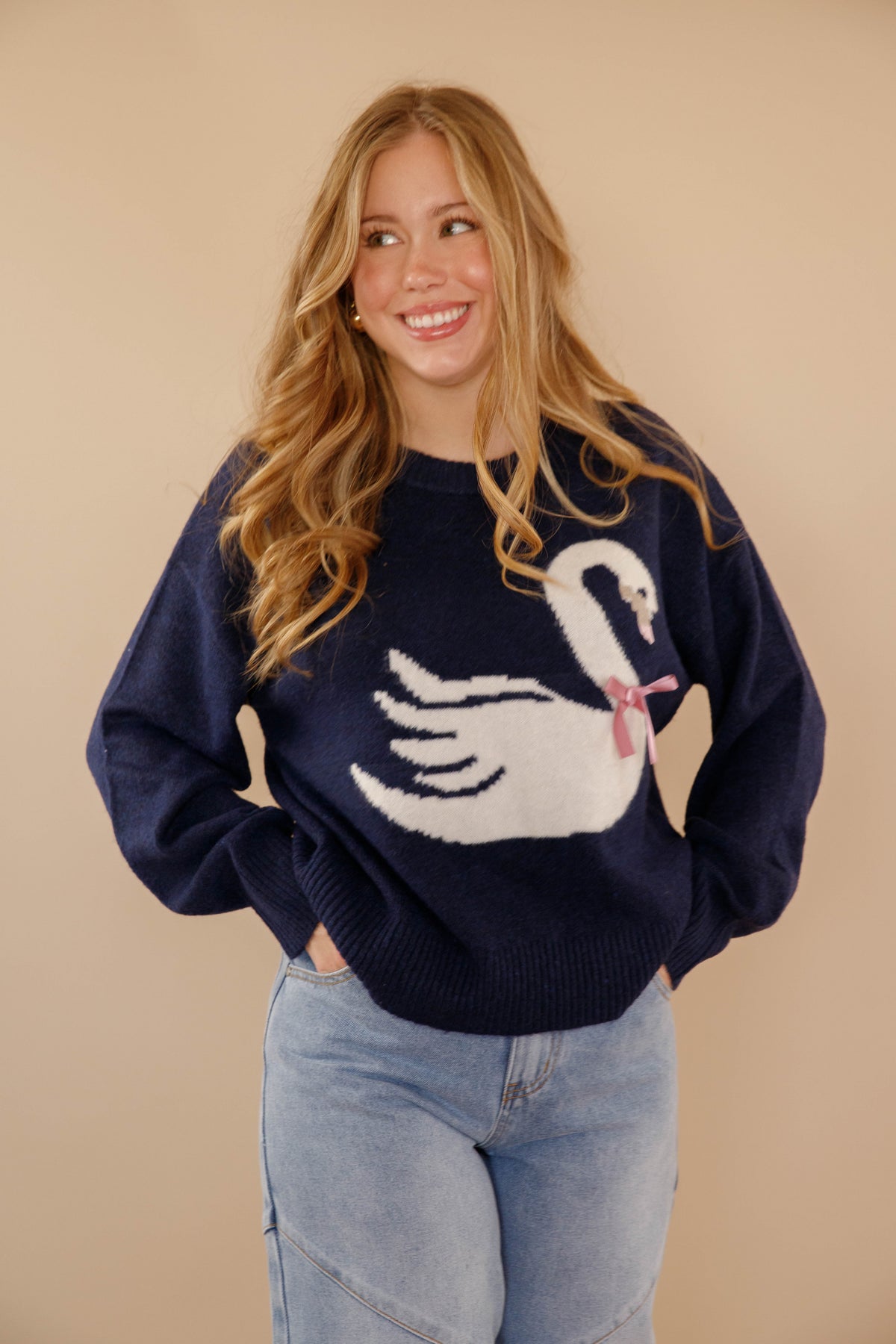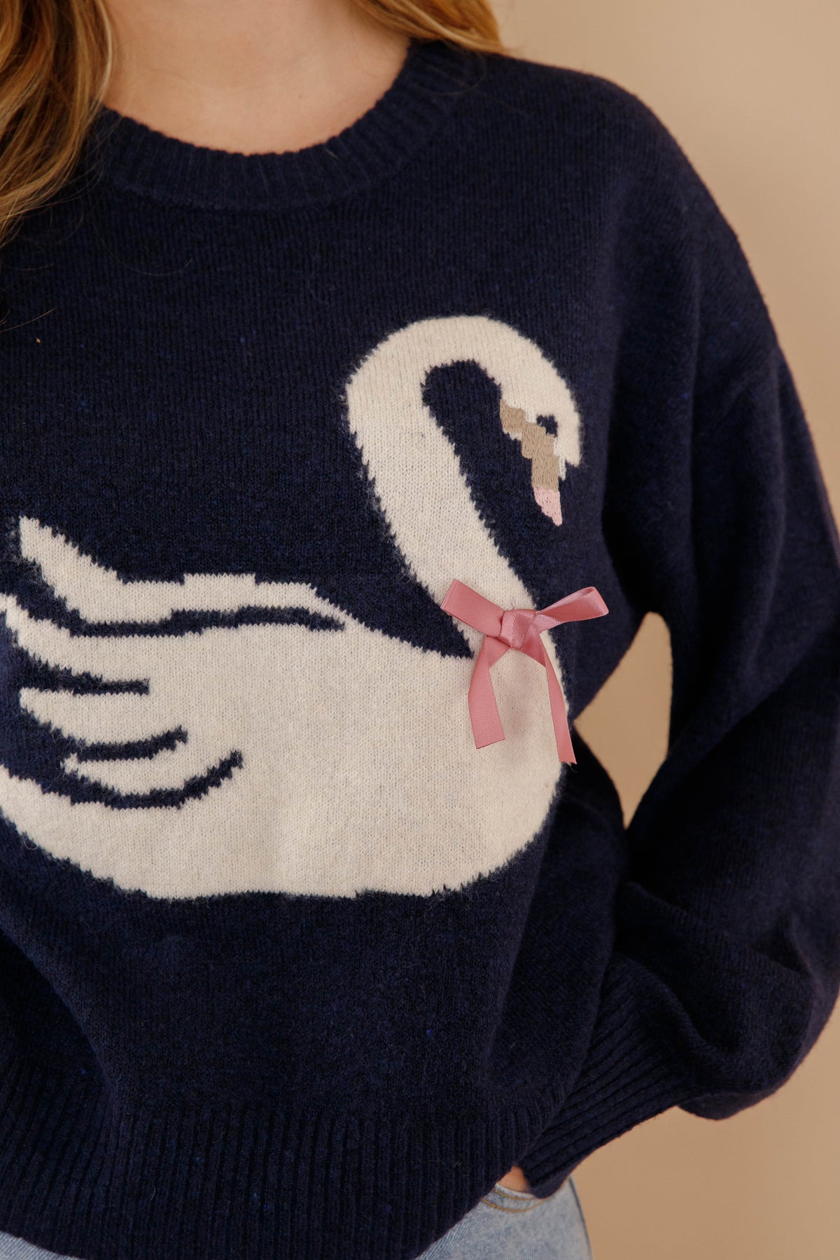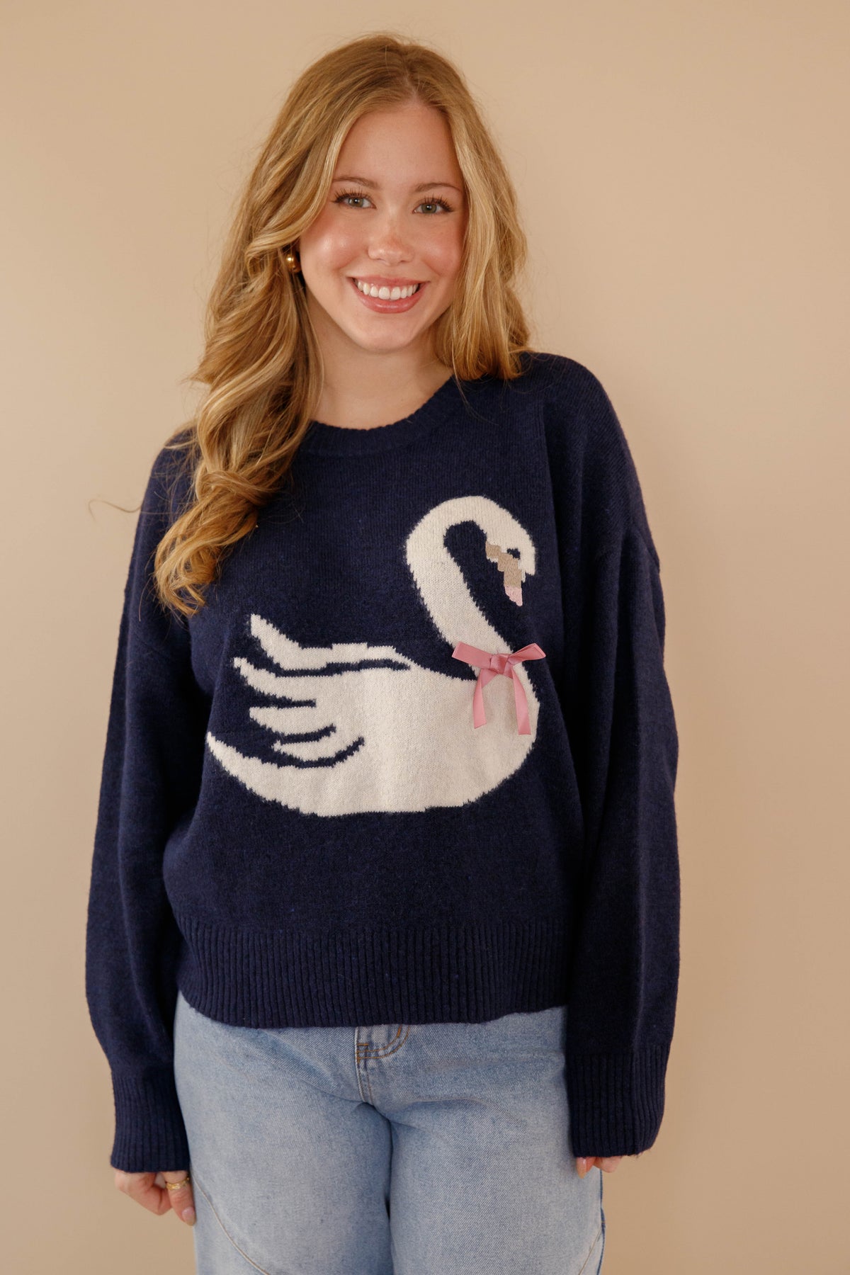 Introducing the My Chosen One Sweater—your new favorite cozy companion! This charming knit pullover features a graceful bow detail at the neckline that adds just the right touch of whimsy. Crafted from a luxurious wool blend with an elegant swan jacquard pattern, it's both sophisticated and fun. The relaxed fit and drop shoulders create an effortlessly chic silhouette, while long sleeves keep you warm and stylish. Perfect for layering or wearing solo, this crew neck sweater is ready to become your go-to piece for casual elegance with personality.