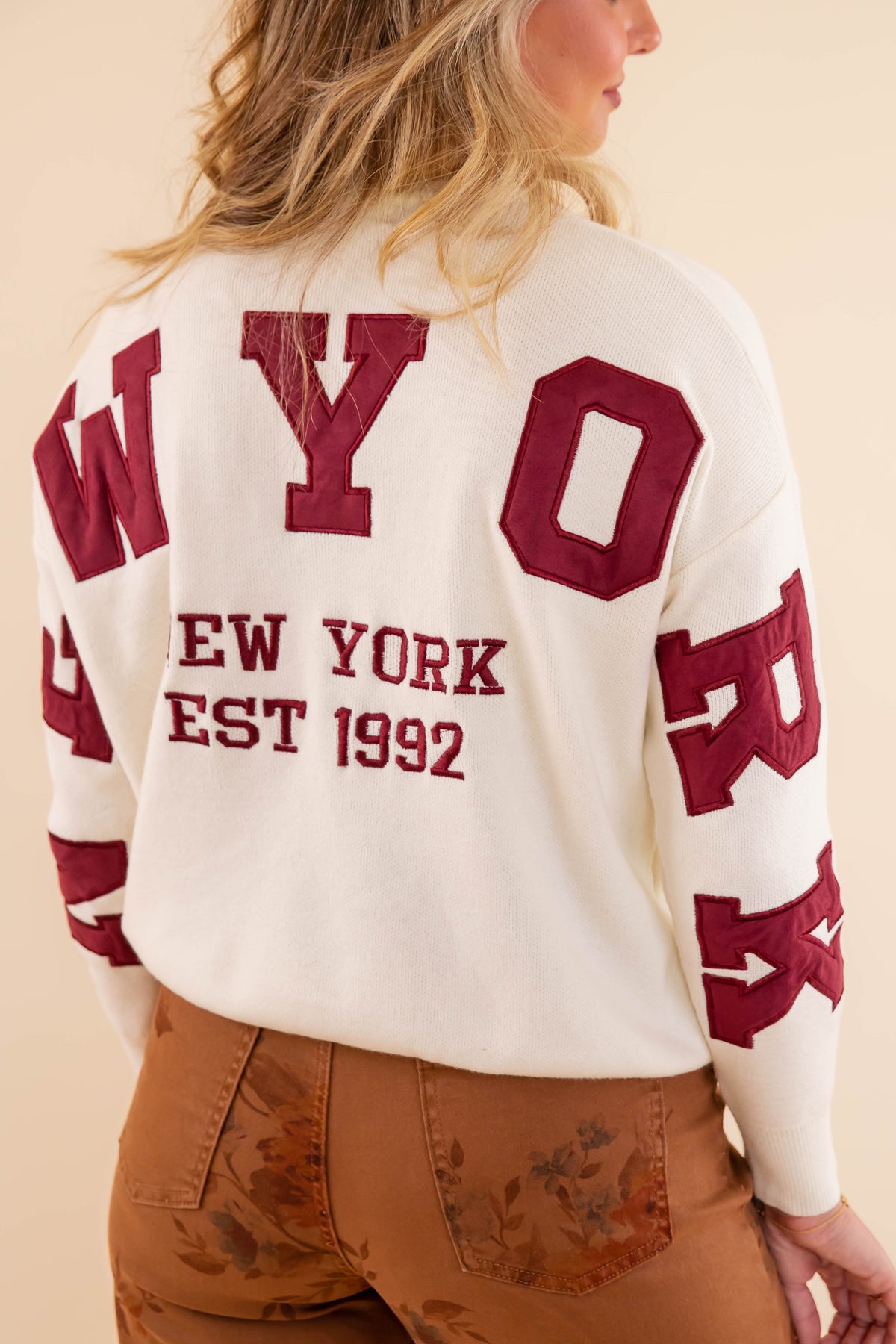 Wrap yourself in Big Apple vibes with this charming ivory sweater that celebrates the city that never sleeps. Featuring plush suede letters spelling "New York" across the sleeves and back, it's the perfect way to show your love for the iconic metropolis. The soft, cozy knit keeps you comfortable while the textured lettering adds a fun, dimensional touch that catches every eye. Whether you're a true New Yorker or just dreaming of the skyline, this playful piece brings that unmistakable NYC energy to your everyday style.