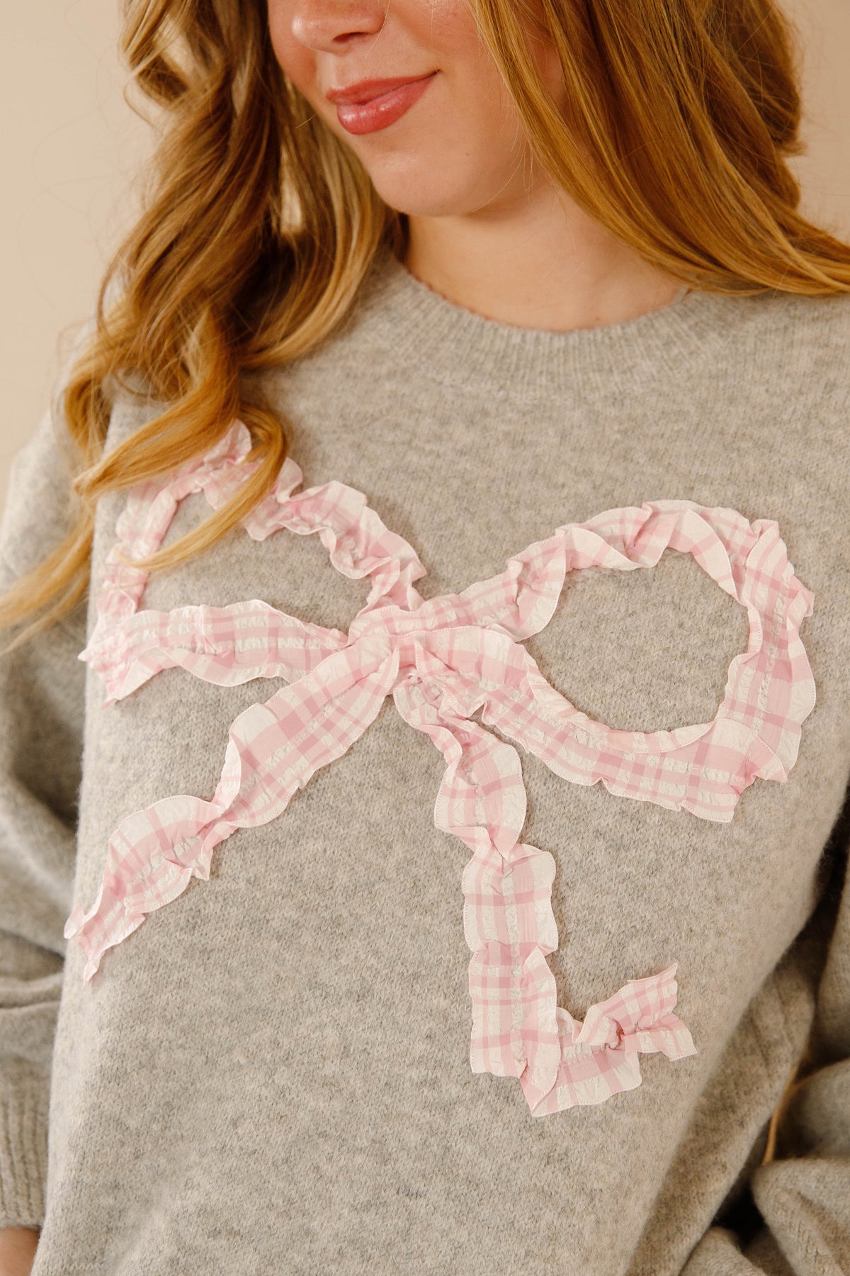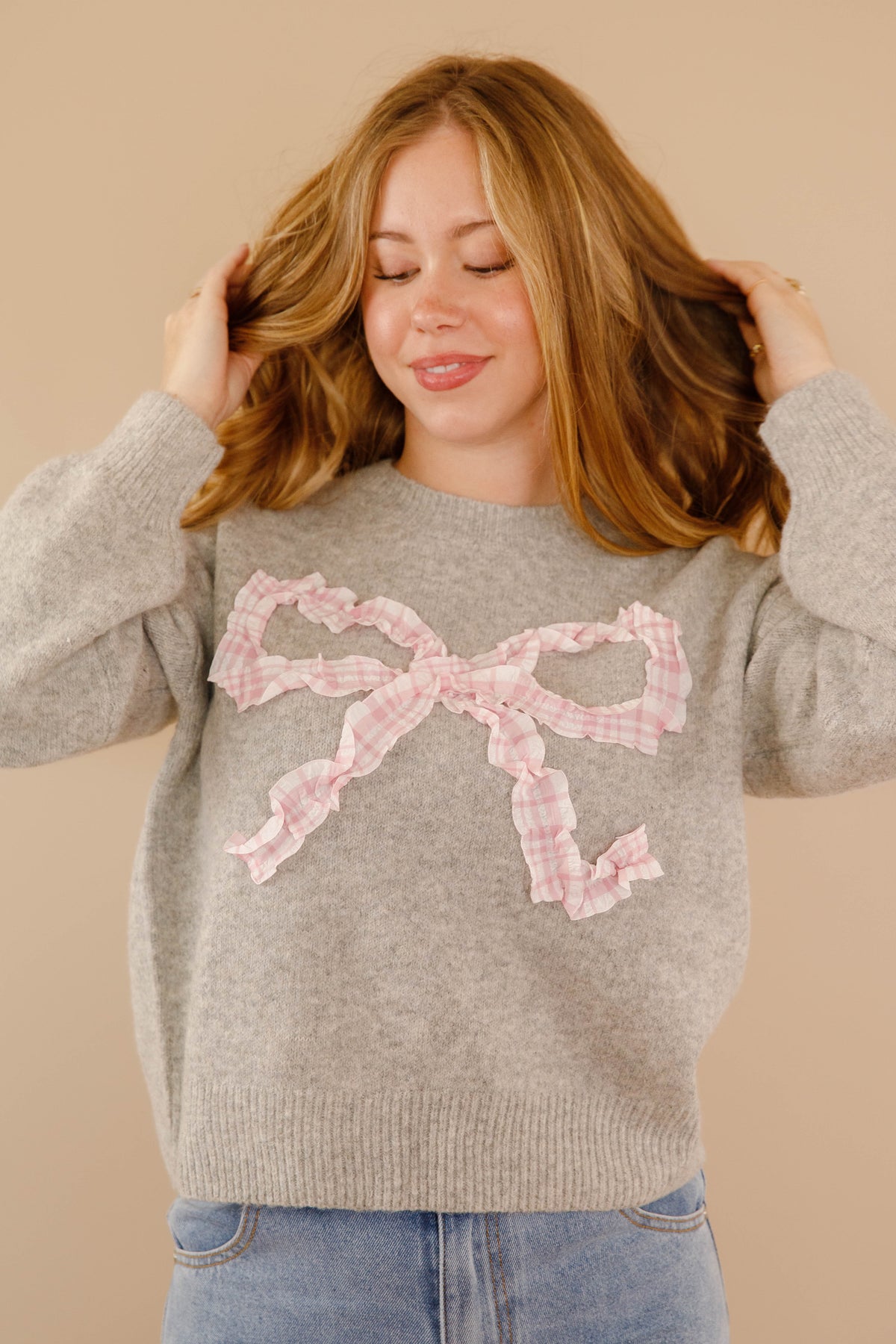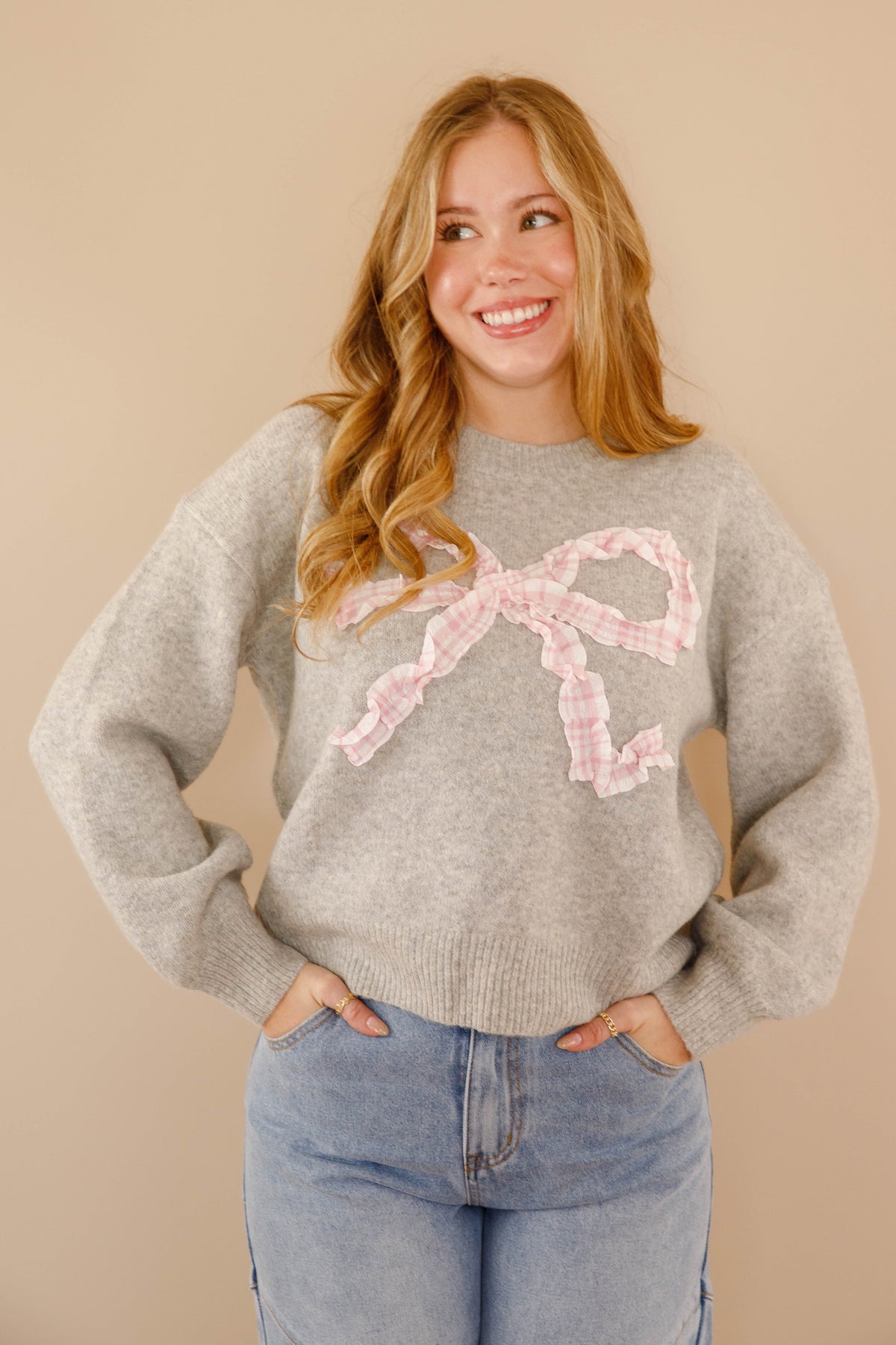 Cozy up in this charming grey knit sweater that strikes the perfect balance between laid-back comfort and effortless style. The relaxed fit drapes beautifully while the slightly cropped length keeps things modern and flattering. But here's where it gets fun—a delightful pink gingham bow adorns the front, adding just the right touch of whimsy and personality. Whether you're going for sweet or sassy, this sweater lets you have it both ways!