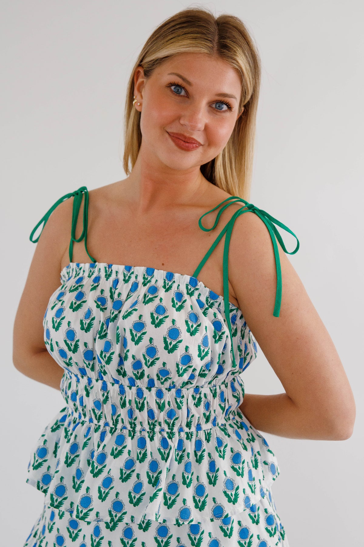 Make a statement this season with this stunning cropped peplum tank top. The captivating green and blue floral design draws the eye, while adjustable self-tie straps let you customize your look to perfection. The elastic waist hugs your curves beautifully, creating an effortlessly polished silhouette. Whether you're lounging poolside or enjoying cocktails under the stars, this versatile piece ensures you'll look and feel confident!