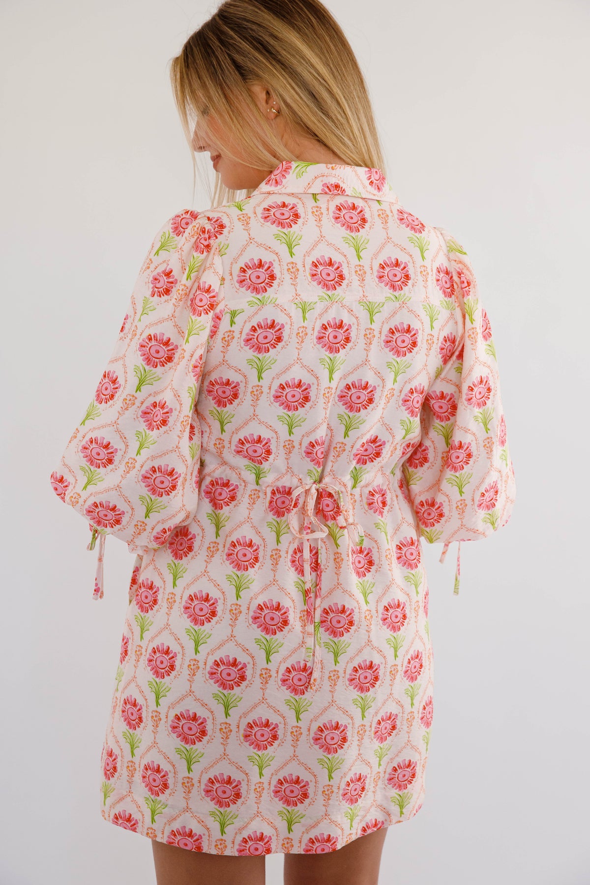 Meet your new go-to dress! This breezy shift style combines comfort with personality, featuring a relaxed fit that's perfect for all-day wear. The collar and three-quarter sleeves with cinched tie details create a flattering frame, while the adjustable waist tie lets you dial in your ideal silhouette. Splashed with a cheerful mix of orange, pink, and green florals, this dress is ready to brighten up your closet and turn heads wherever you go!