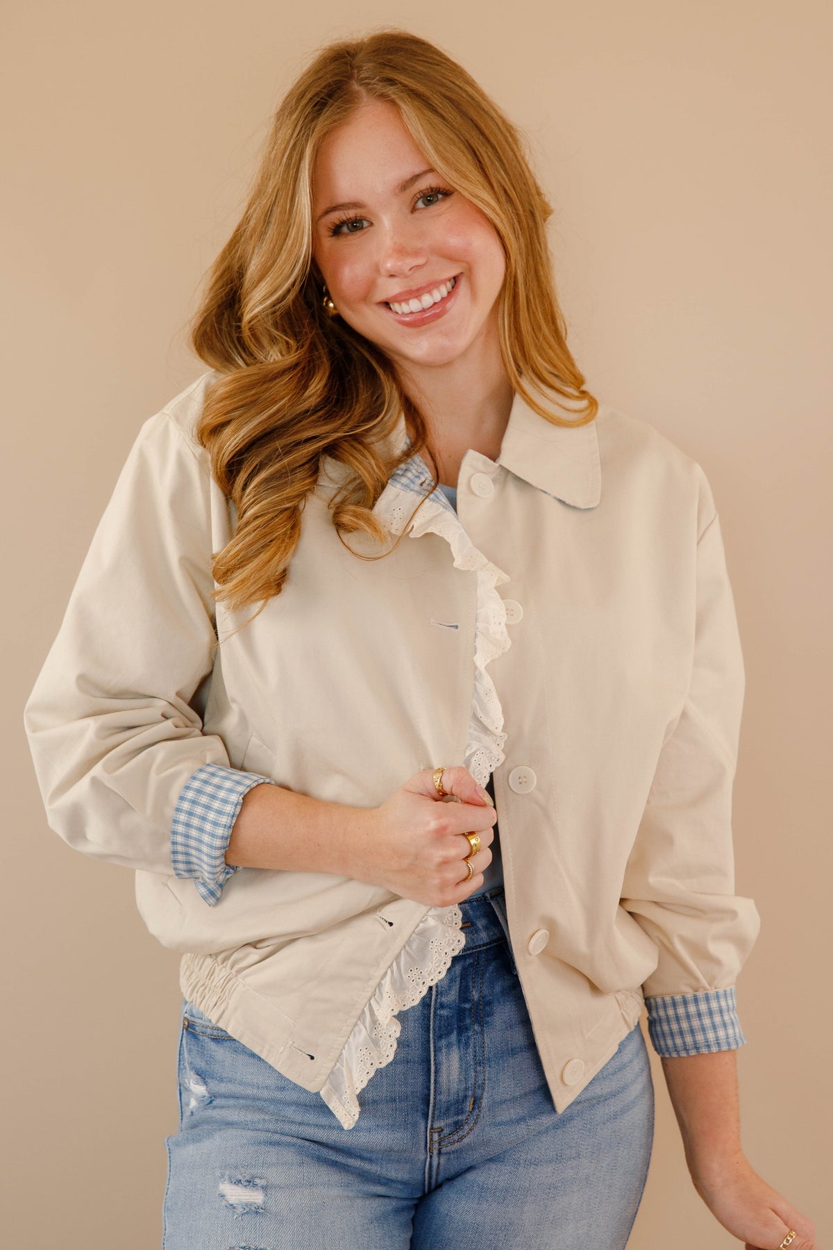 Double the style, double the fun! This reversible coat is your secret weapon for outfit variety. Flip between a cheerful gingham print and a sleek neutral solid depending on your mood—because why choose when you can have both? Topped with charming ruffle trim that adds a playful feminine flair, this coat keeps things fresh and exciting. Whether you're layering through winter or transitioning into spring, this clever piece ensures you'll never get bored with your outerwear rotation.