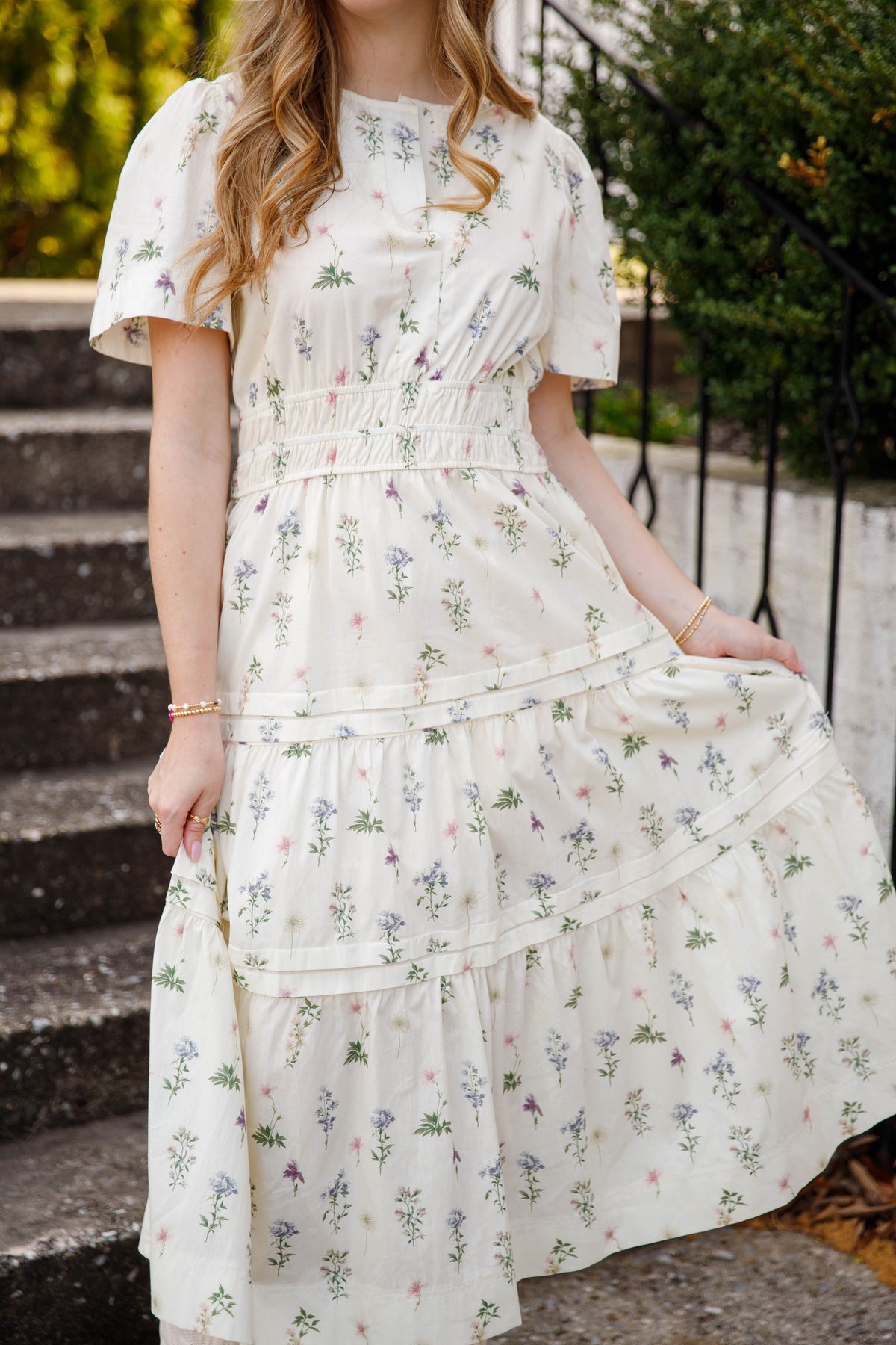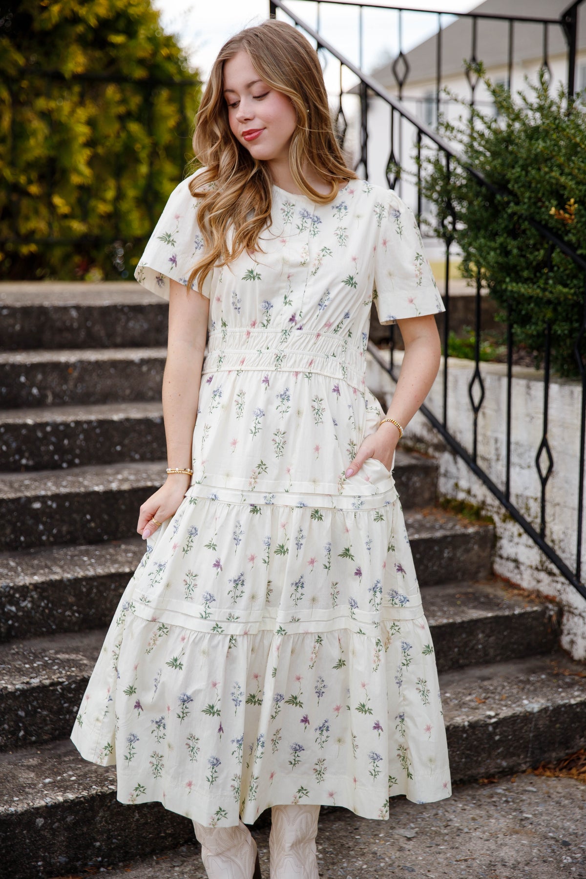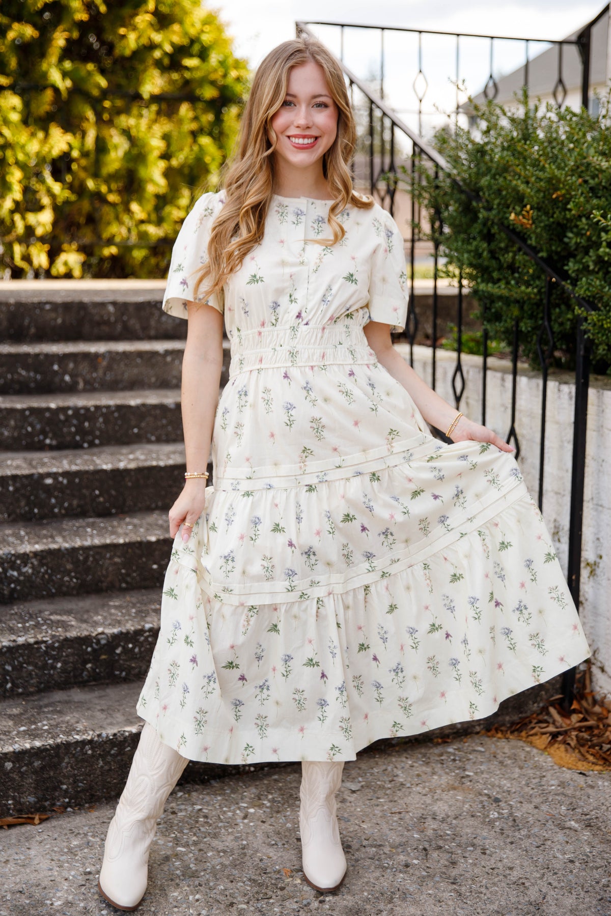 This cream floral tiered midi dress is a beautiful staple for spring and summer styling. Designed with a classic v-neck and short sleeves, this dress also features an elastic smocked waistband that gently defines the silhouette while offering all-day comfort.