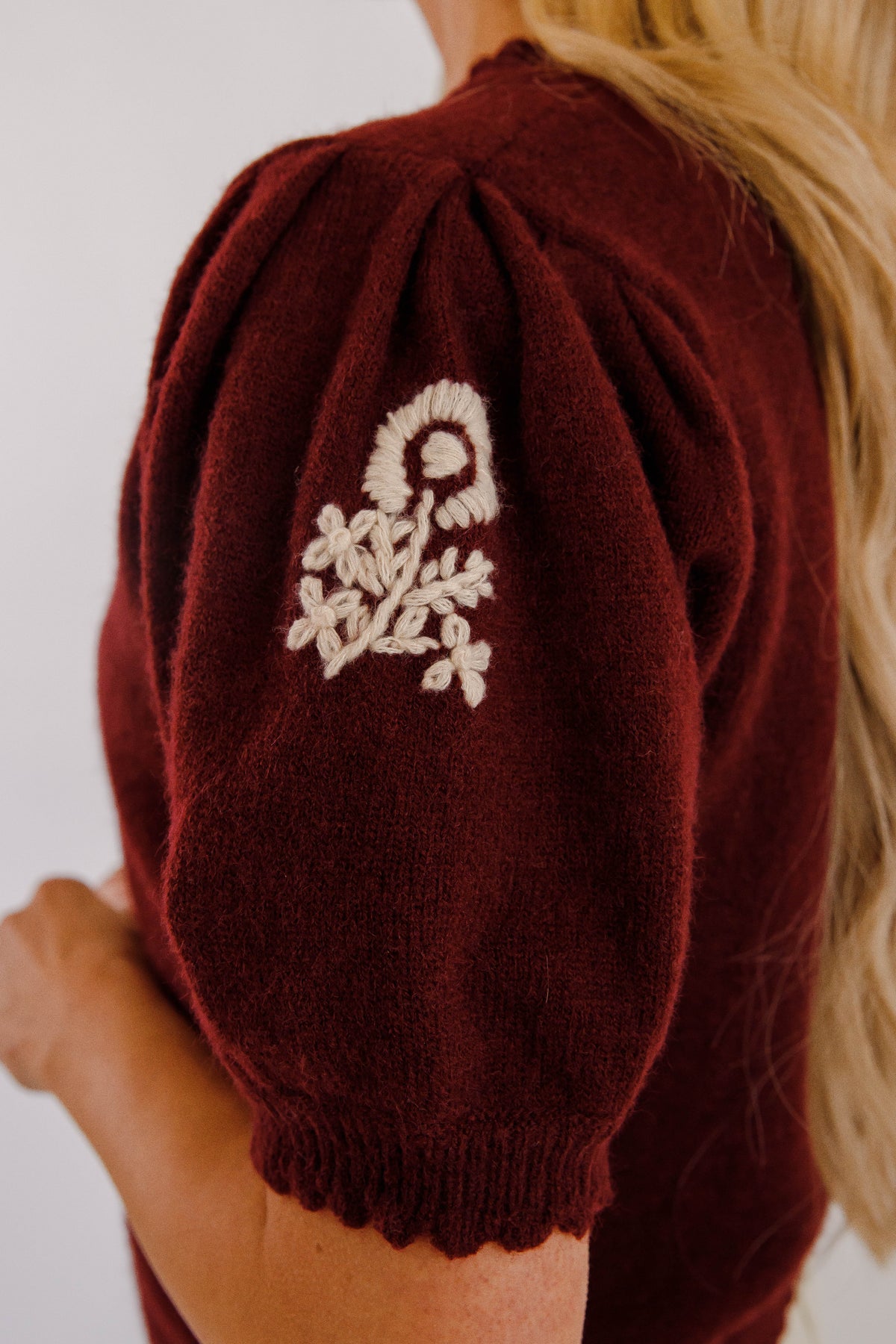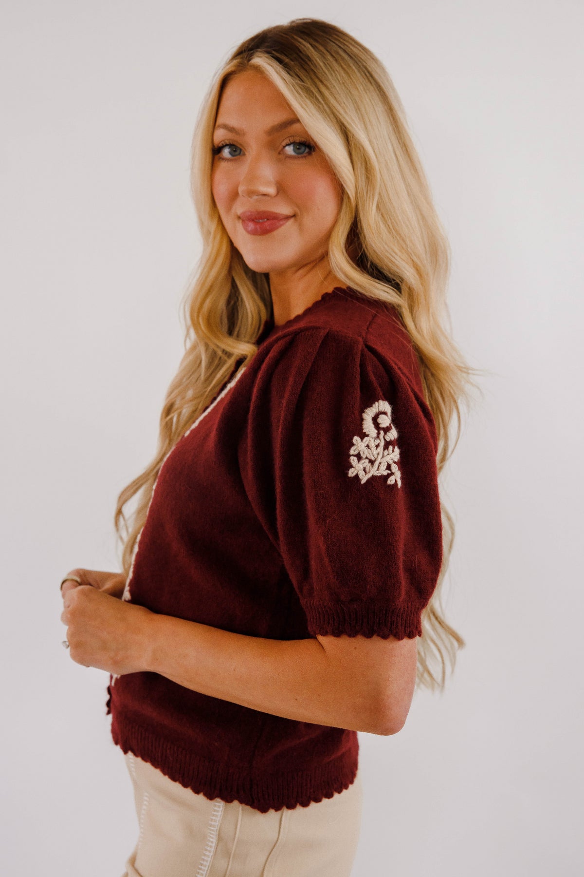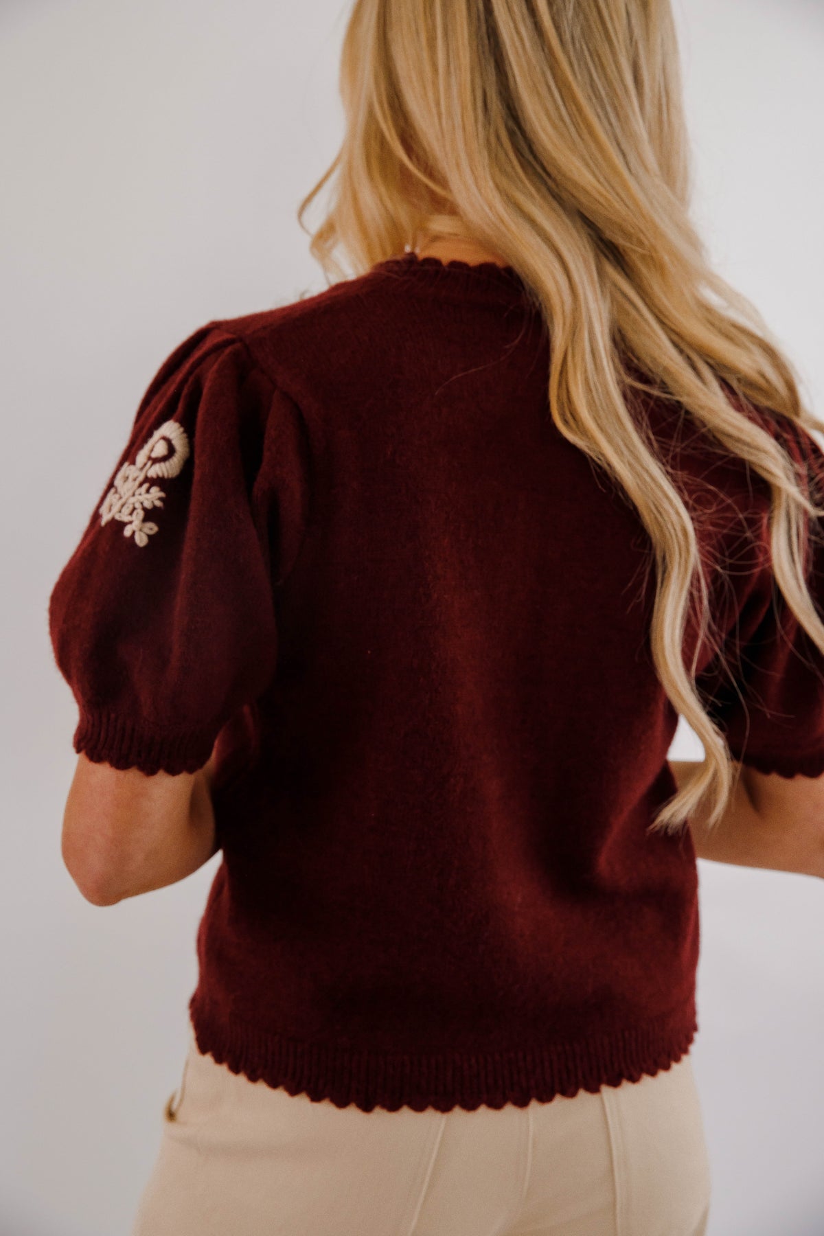 Add a touch of timeless elegance with this maroon short puff sleeve knit cardigan. Featuring delicate ivory floral embroidery and a scalloped edge round neckline, it offers a soft, feminine silhouette. The button-front closure combines style with practicality, making it an easy choice for both casual and dressier occasions. Comfortable and chic, this top is a versatile addition to any wardrobe.