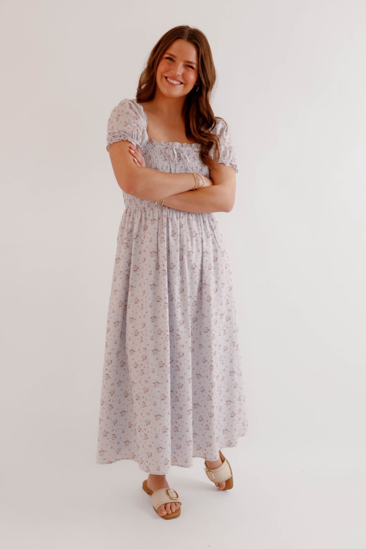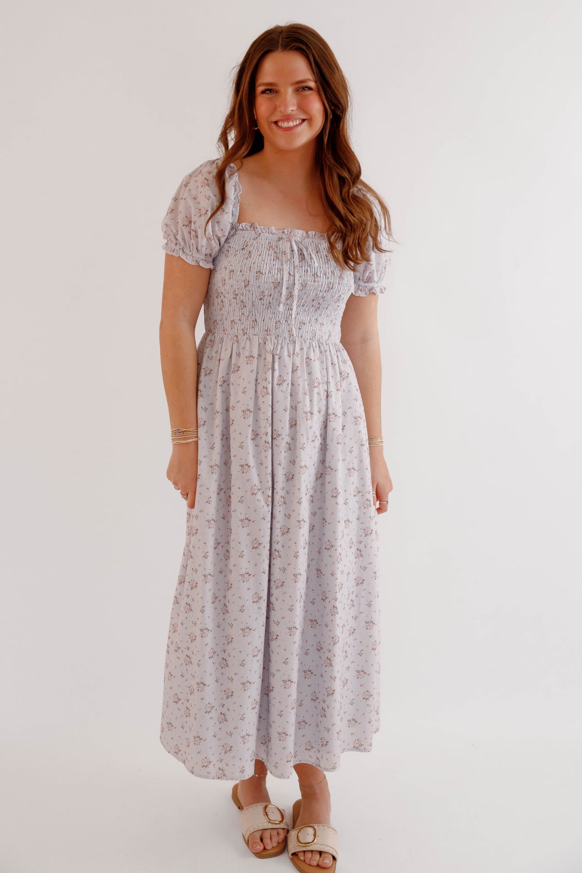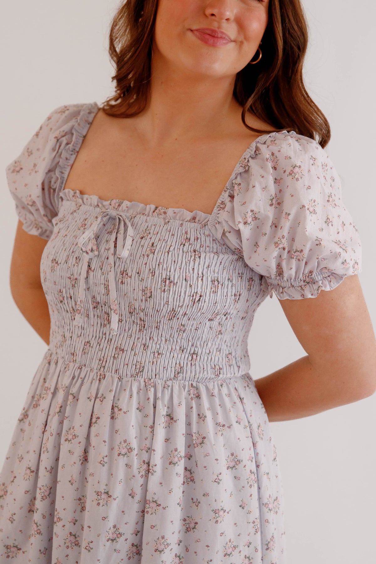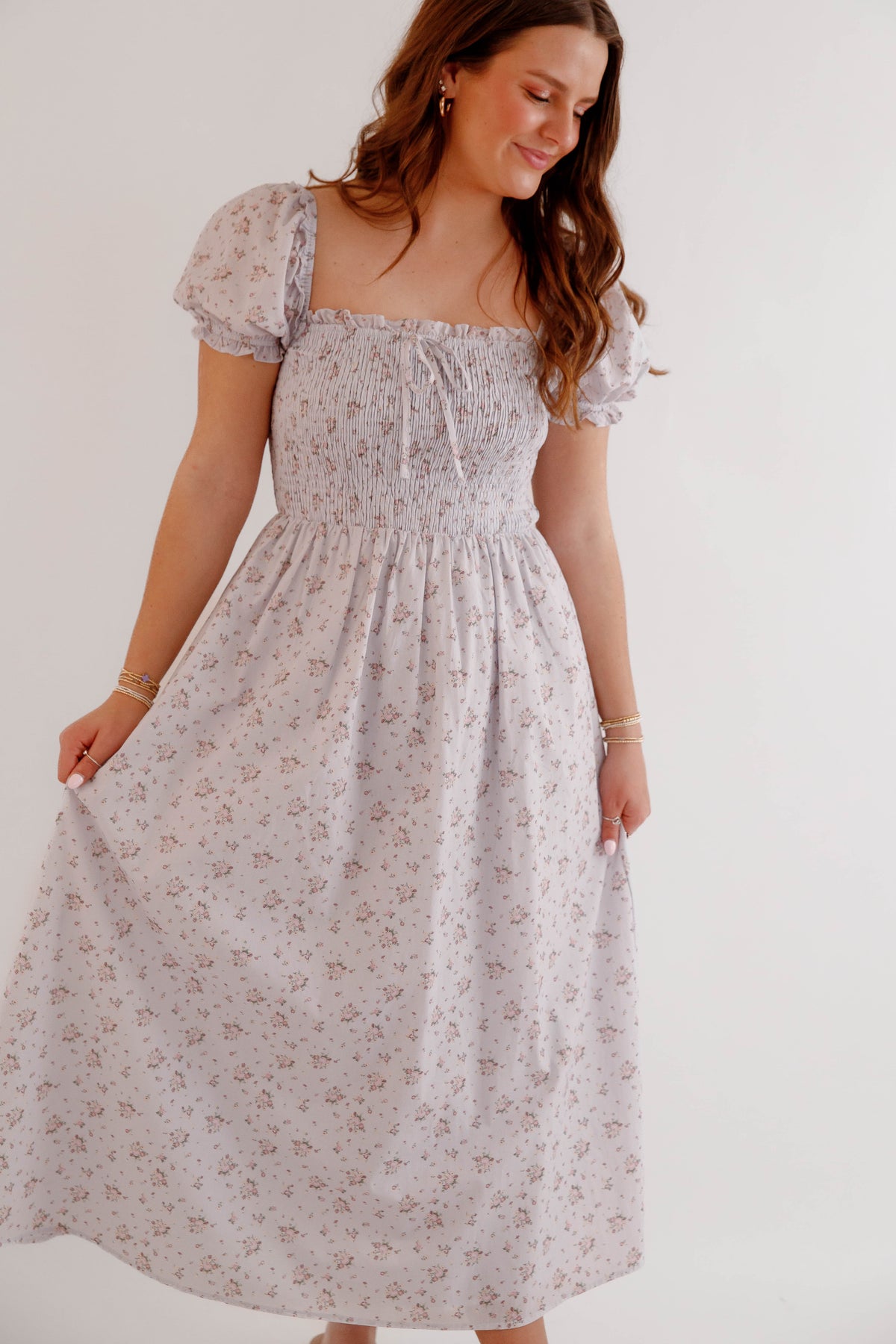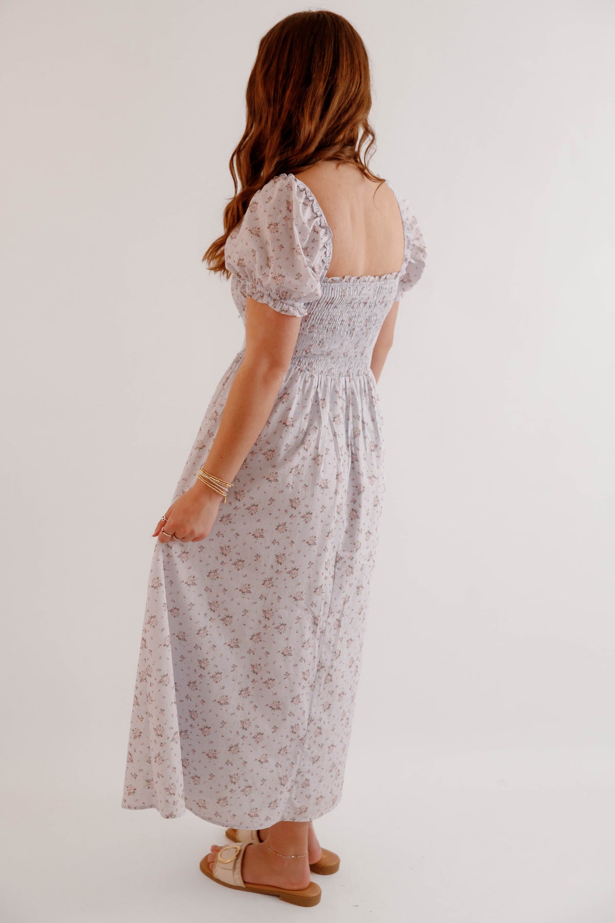 Soft, romantic, and effortlessly feminine, this floral smocked puff sleeve midi dress is a timeless addition to any spring and summer wardrobe. Designed with a beautifully textured smocked bodice, this dress offers a flattering and comfortable fit while highlighting the waist with a softly gathered midi-length skirt that moves beautifully with every step. Delicate puff sleeves and a subtle floral print give this dress a charming cottagecore-inspired aesthetic, perfect for brunch dates, garden parties, weddings, vacations, or everyday feminine styling. The square neckline adds a touch of vintage elegance, while the lightweight fabric keeps the look breathable and easy to wear all season long.