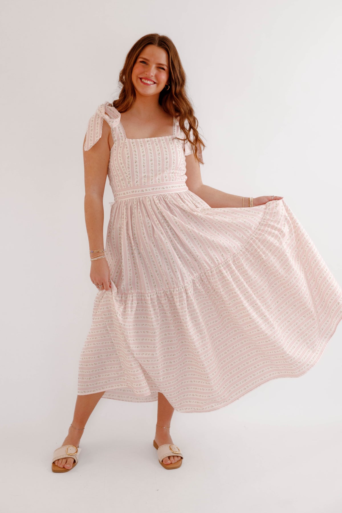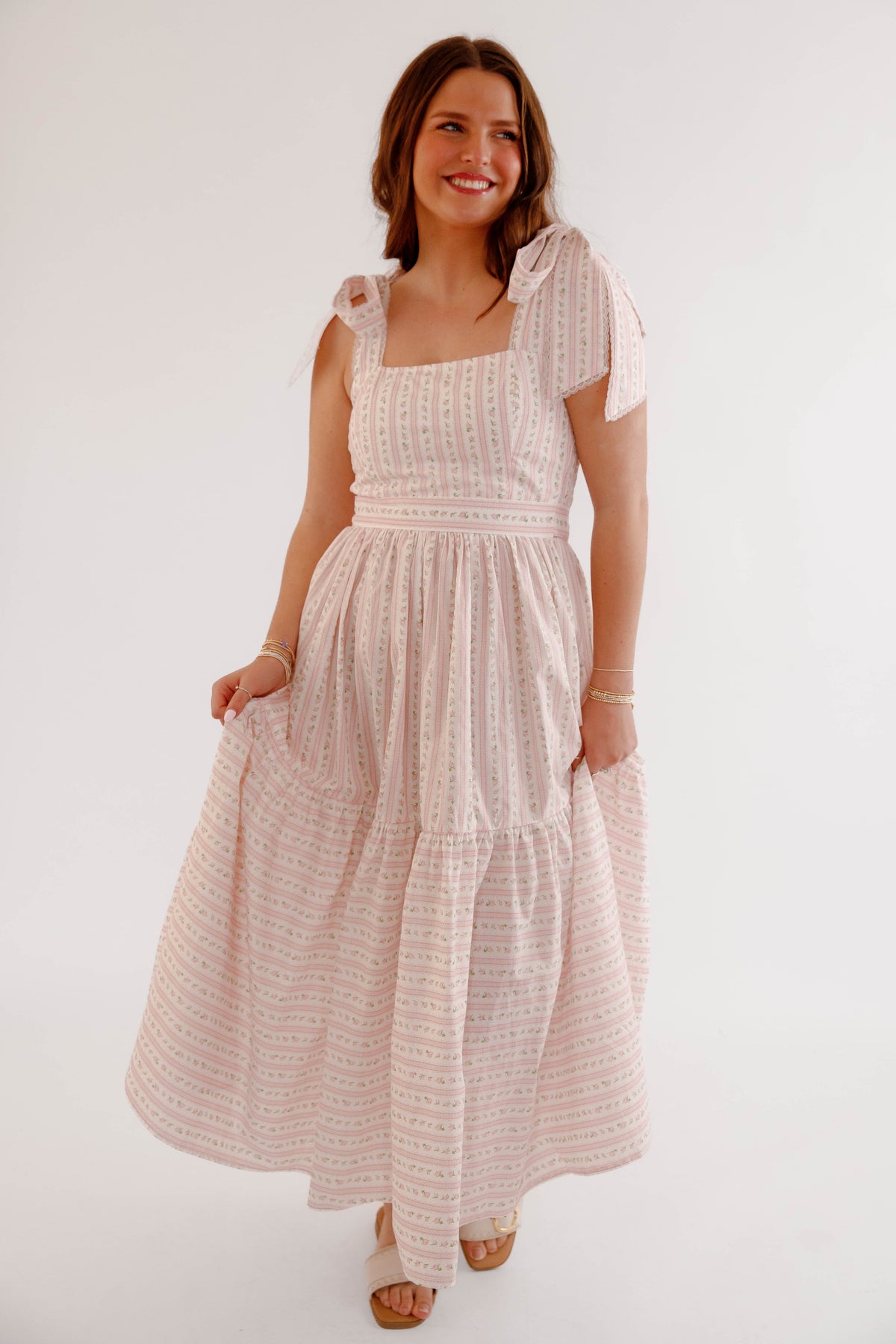 This pink floral bow shoulder midi dress is the perfect piece for spring and summer styling. Designed with a flattering square neckline and delicate bow tie shoulder straps, this dress offers a soft, feminine silhouette that feels both timeless and playful. The subtle pink floral pattern paired with delicate vertical detailing creates a vintage-inspired cottagecore aesthetic, while the fitted bodice and flowing tiered midi skirt provide comfort and beautiful movement. The back of the dress is smocked for a flexible fit.