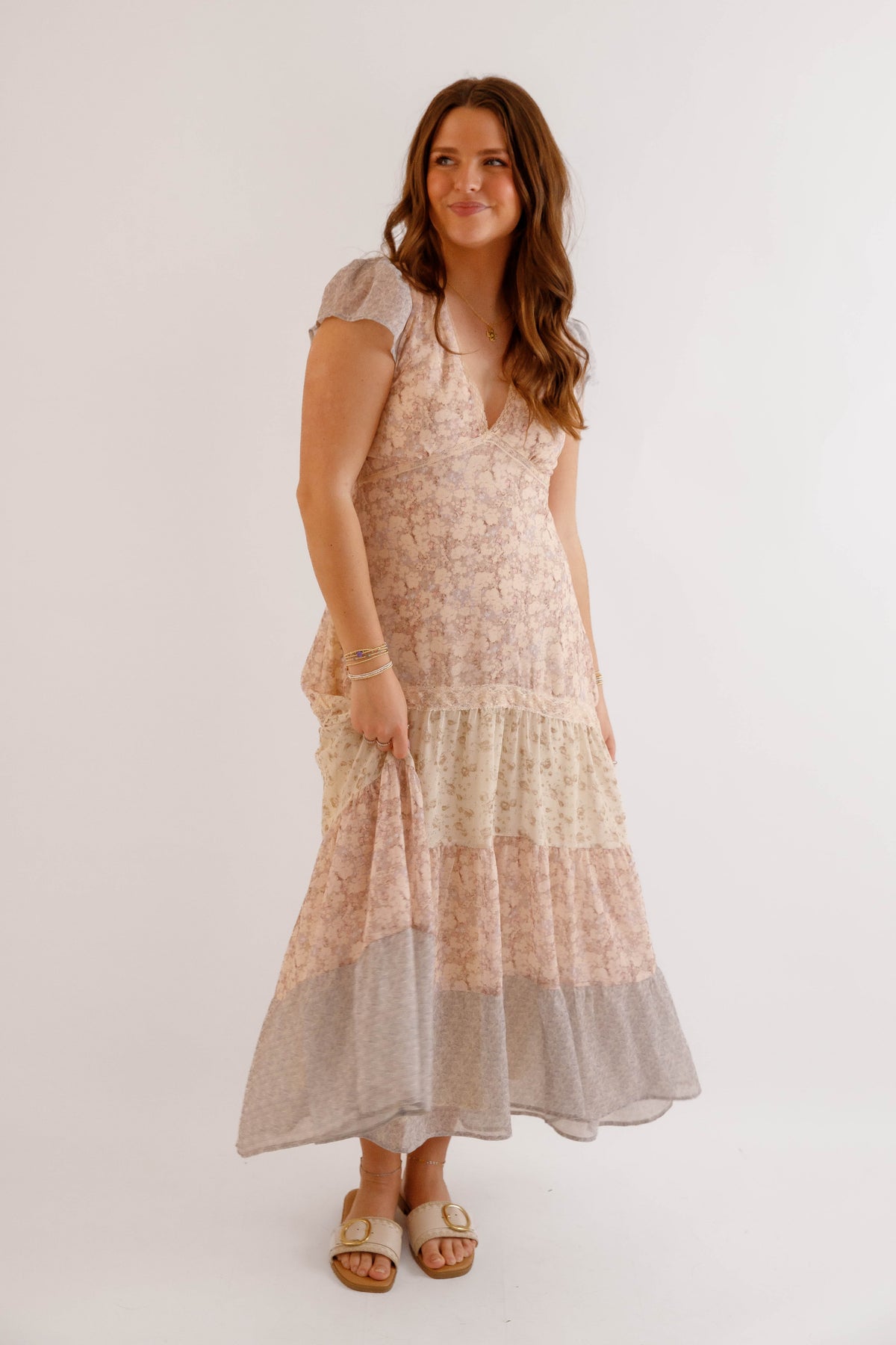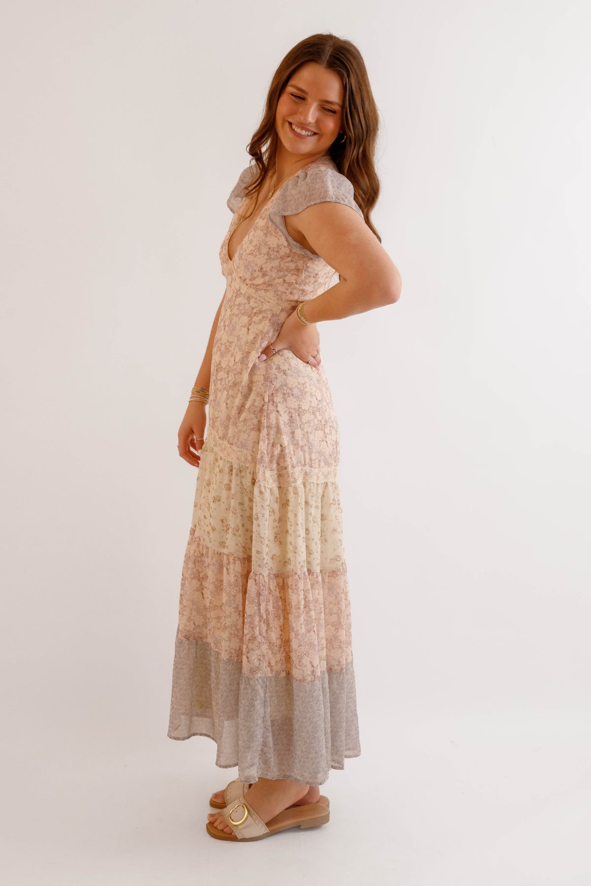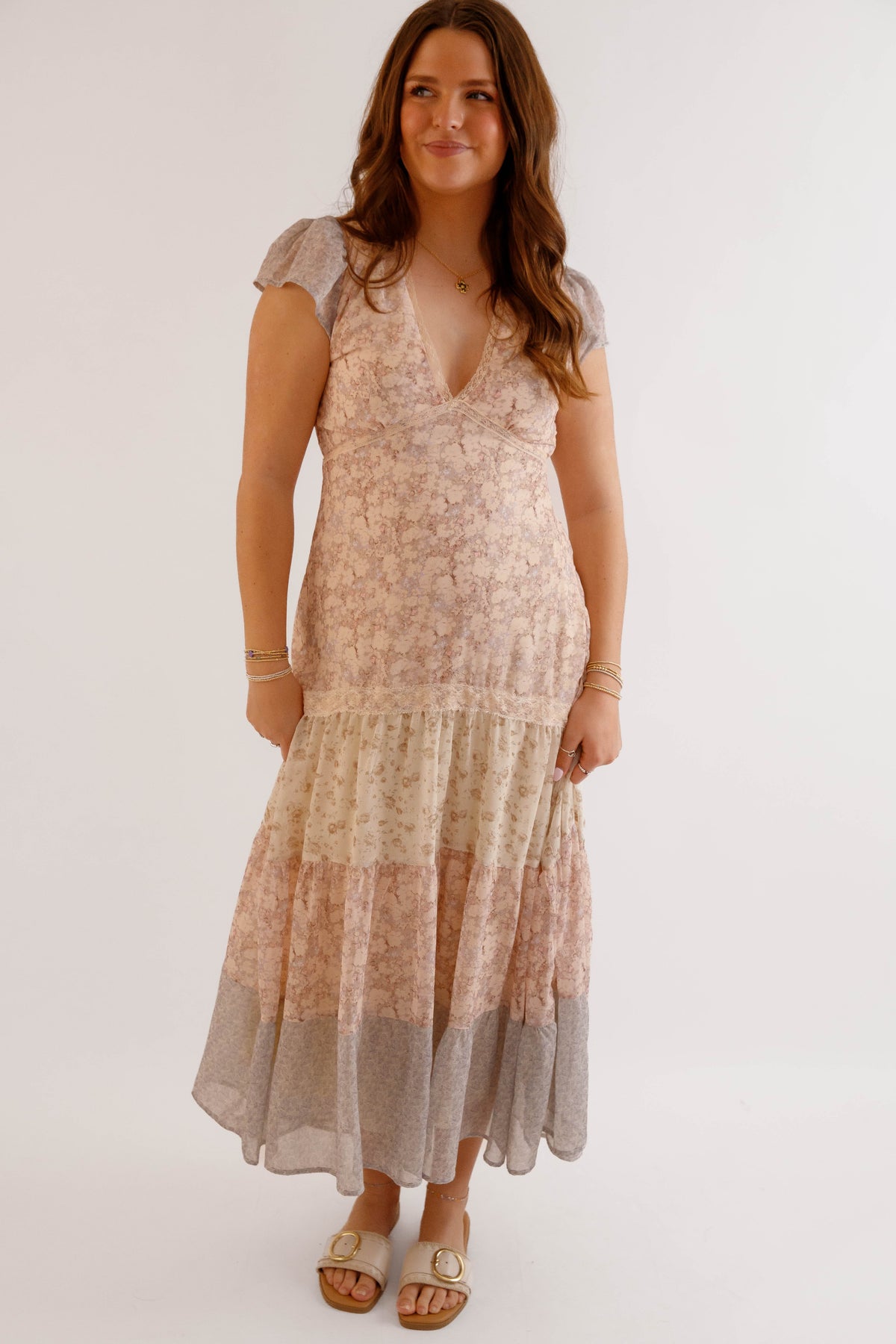 Soft, romantic, and effortlessly feminine, this tiered floral maxi dress is designed with a flattering fitted bodice and delicate flutter sleeves, a graceful V-neckline and a flowing tiered skirt that creates beautiful movement with every step. The muted floral print and soft neutral tones give this dress a timeless romantic and boho-inspired feel, making it perfect for spring weddings, garden parties, brunch dates, vacations, or everyday elevated style. The back of the dress has an elastic waist for an easy fit with a hidden side zipper. Lightweight and airy, the layered skirt adds texture and dimension while keeping the silhouette flattering and comfortable.