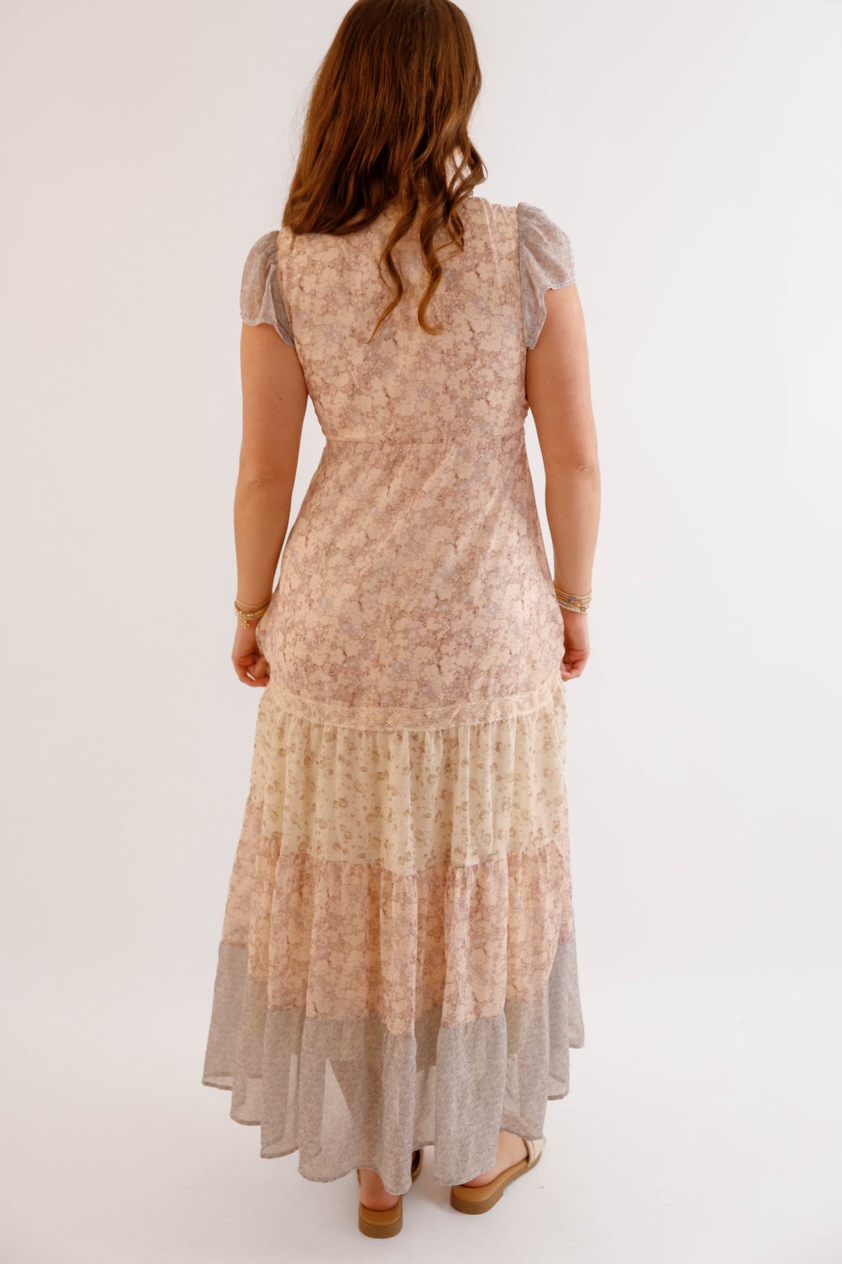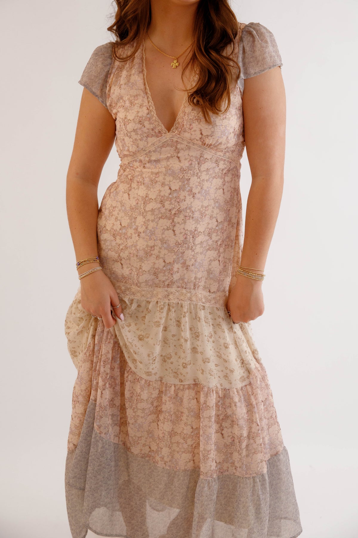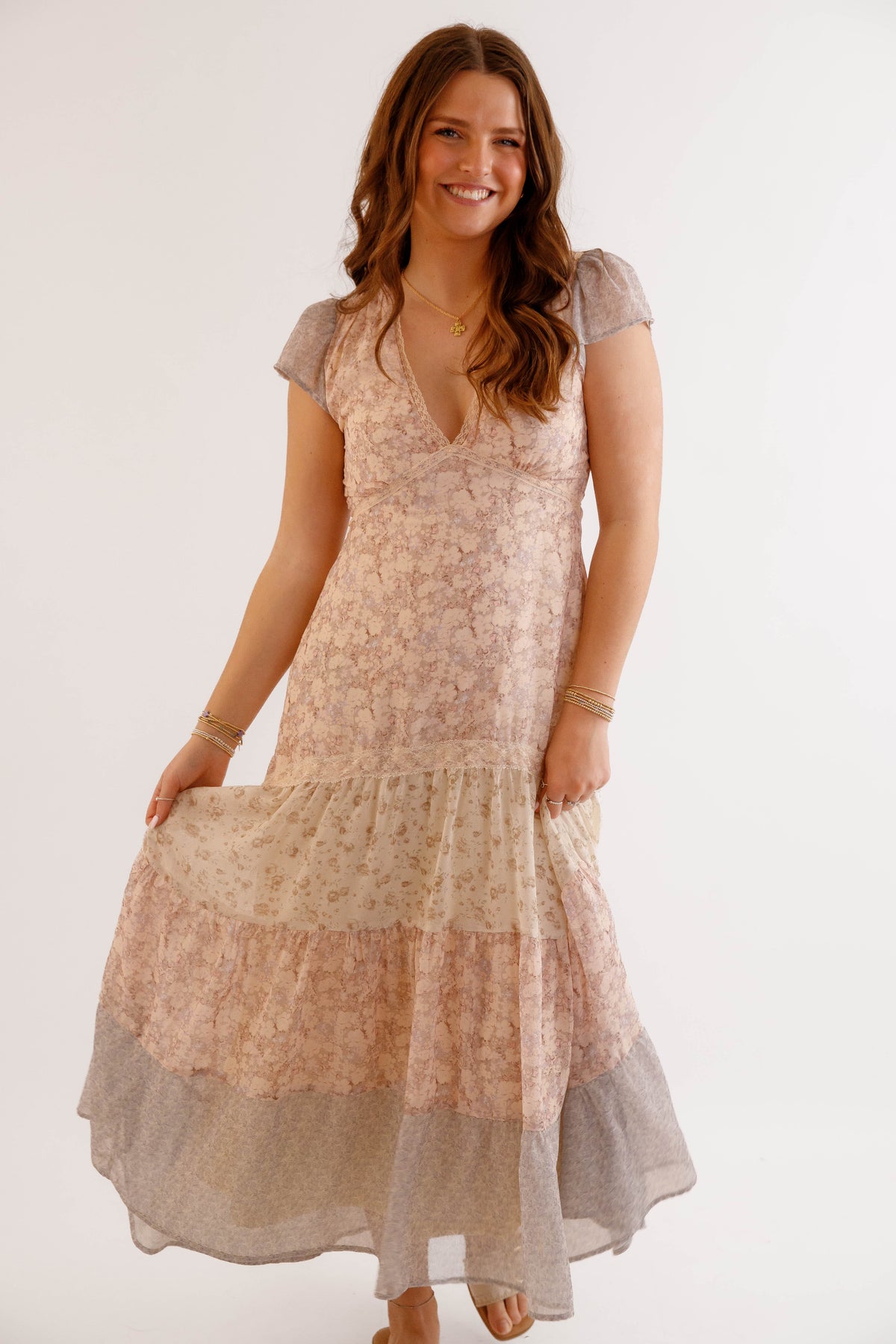 Soft, romantic, and effortlessly feminine, this tiered floral maxi dress is designed with a flattering fitted bodice and delicate flutter sleeves, a graceful V-neckline and a flowing tiered skirt that creates beautiful movement with every step. The muted floral print and soft neutral tones give this dress a timeless romantic and boho-inspired feel, making it perfect for spring weddings, garden parties, brunch dates, vacations, or everyday elevated style. The back of the dress has an elastic waist for an easy fit with a hidden side zipper. Lightweight and airy, the layered skirt adds texture and dimension while keeping the silhouette flattering and comfortable.
