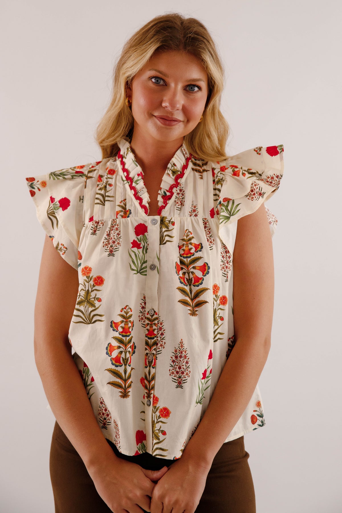 The Moral Of The Story Blouse features an ivory base adorned with vibrant florals in orange, red, and green, creating a sophisticated boho look. Its ruffled sleeves bring a touch of drama, while the pleated neckline with embroidered trim adds refined detail. Made from a lightweight cotton blend, this blouse ensures comfort all day and transitions effortlessly from warm afternoons to layered styling. Its flowy silhouette flatters various body types, making it an easy and stylish choice for any occasion!