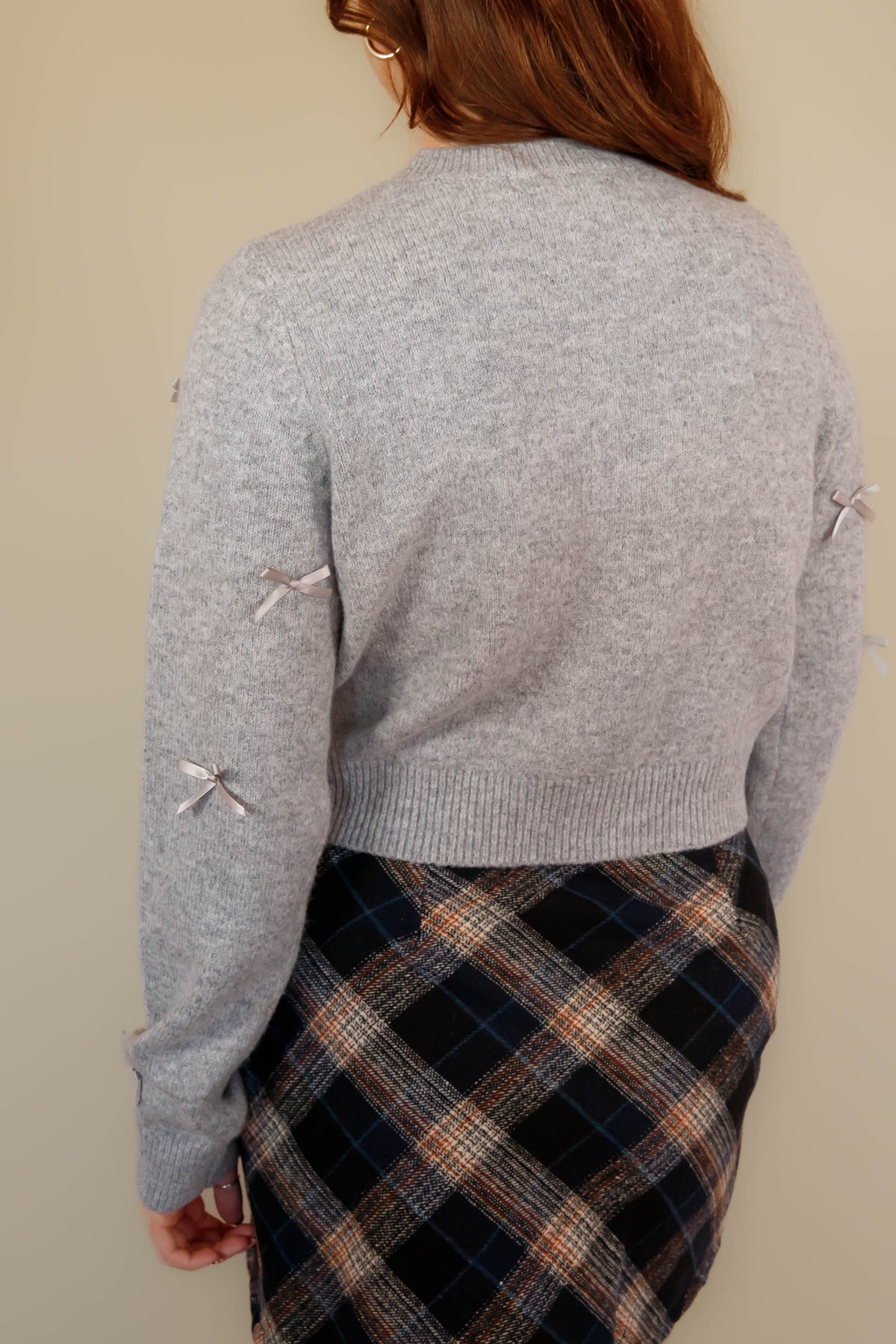 Discover the perfect layering piece with this sophisticated cropped knit cardigan! Its crew neckline and long sleeves provide timeless appeal, while elegant fabric ribbon accents add visual interest and dimension. The convenient front button closure allows for easy styling versatility, and thoughtfully placed ribbed trim at the cuffs and hem creates a polished silhouette. Whether you're dressing up a casual outfit or adding warmth to an evening look, this cardigan delivers both comfort and style that works harder than you'd expect!