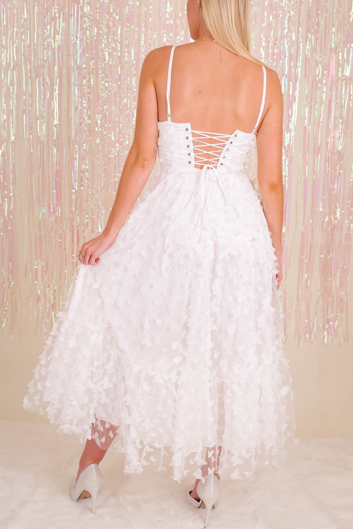 Capture hearts and turn heads in this ethereal Unconditional Love Midi dress. Its sheer mesh bodice is decorated with eye-catching 3D butterfly appliques, forming a sweetheart neckline with seamed cups supported by adjustable straps. A high-waisted midi skirt flares to a tulle-enforced tier at the hem, cinched with laces in silver aglets at the back. Hidden back zipper. Dare to be beautiful!