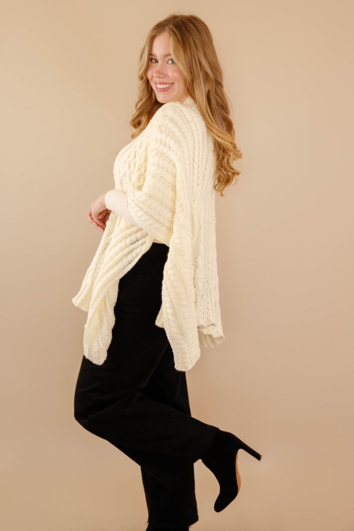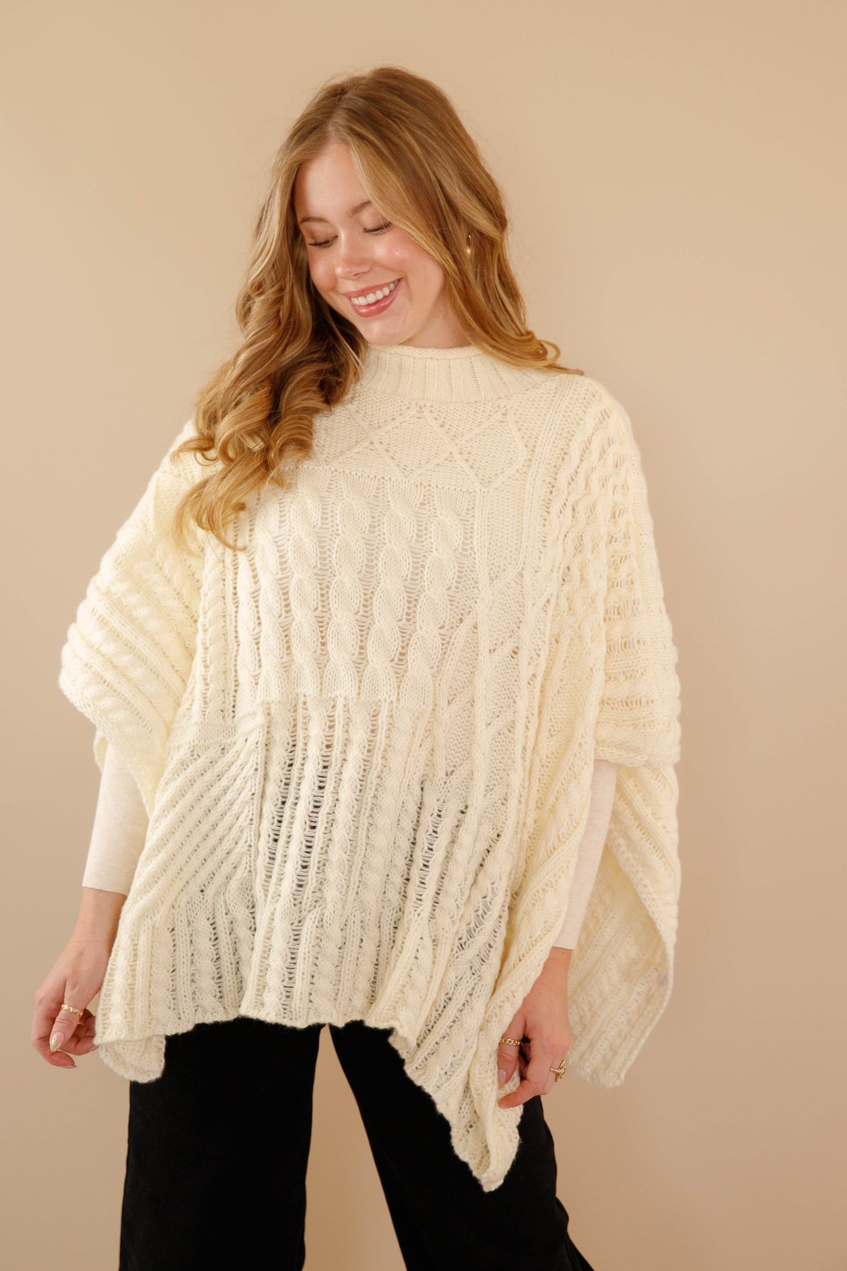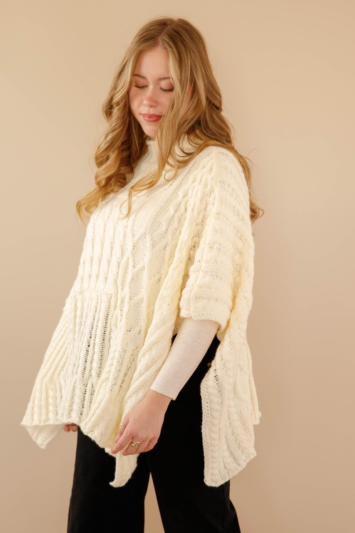 Wrap yourself in early 2000s nostalgia with this oversized cable-knit mock neck poncho sweater! Crafted in creamy ivory, it's the ultimate main character moment—effortlessly chic and undeniably retro. The cozy knit texture and relaxed silhouette deliver that coveted vintage vibe while keeping you warm and comfortable. Perfect for layering over your favorite basics or wearing solo, this poncho captures the essence of a beloved era. Channel your inner diva and make a statement that's both timeless and thoroughly on-trend!