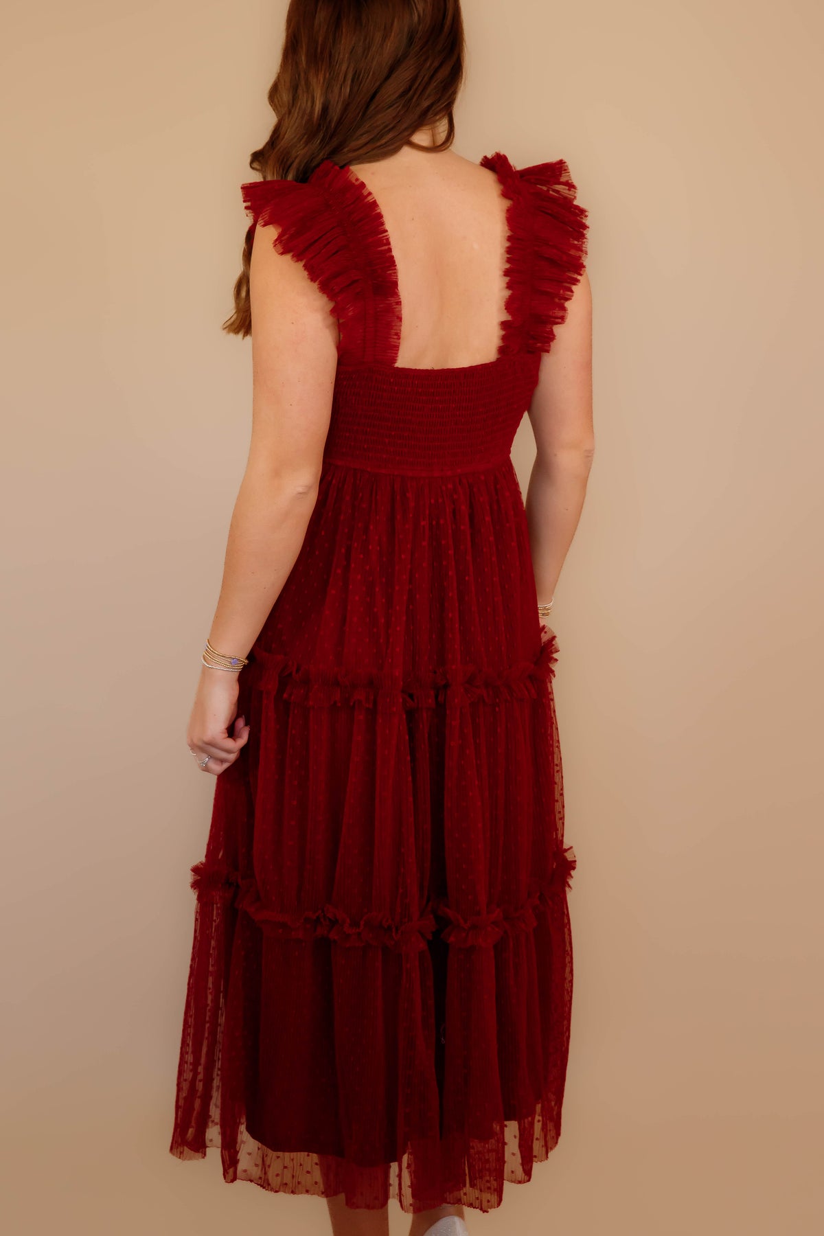 Discover the dress that transforms any occasion into something memorable! This wine swiss dot midi dress combines timeless elegance with modern details that truly stand out. The sweetheart neckline creates an instantly flattering frame, while elastic ruffle straps add playful sophistication. Tiered ruffles cascade down the skirt for graceful movement and visual interest, and the back smocking ensures a personalized, comfortable fit that adapts to your body. From casual gatherings to special celebrations, this versatile piece is the answer to looking polished and put-together effortlessly!