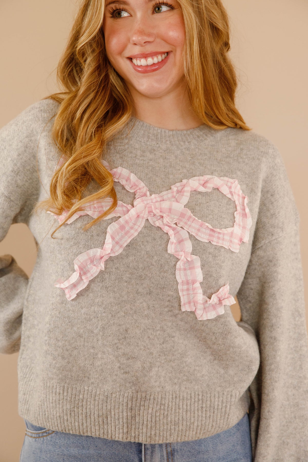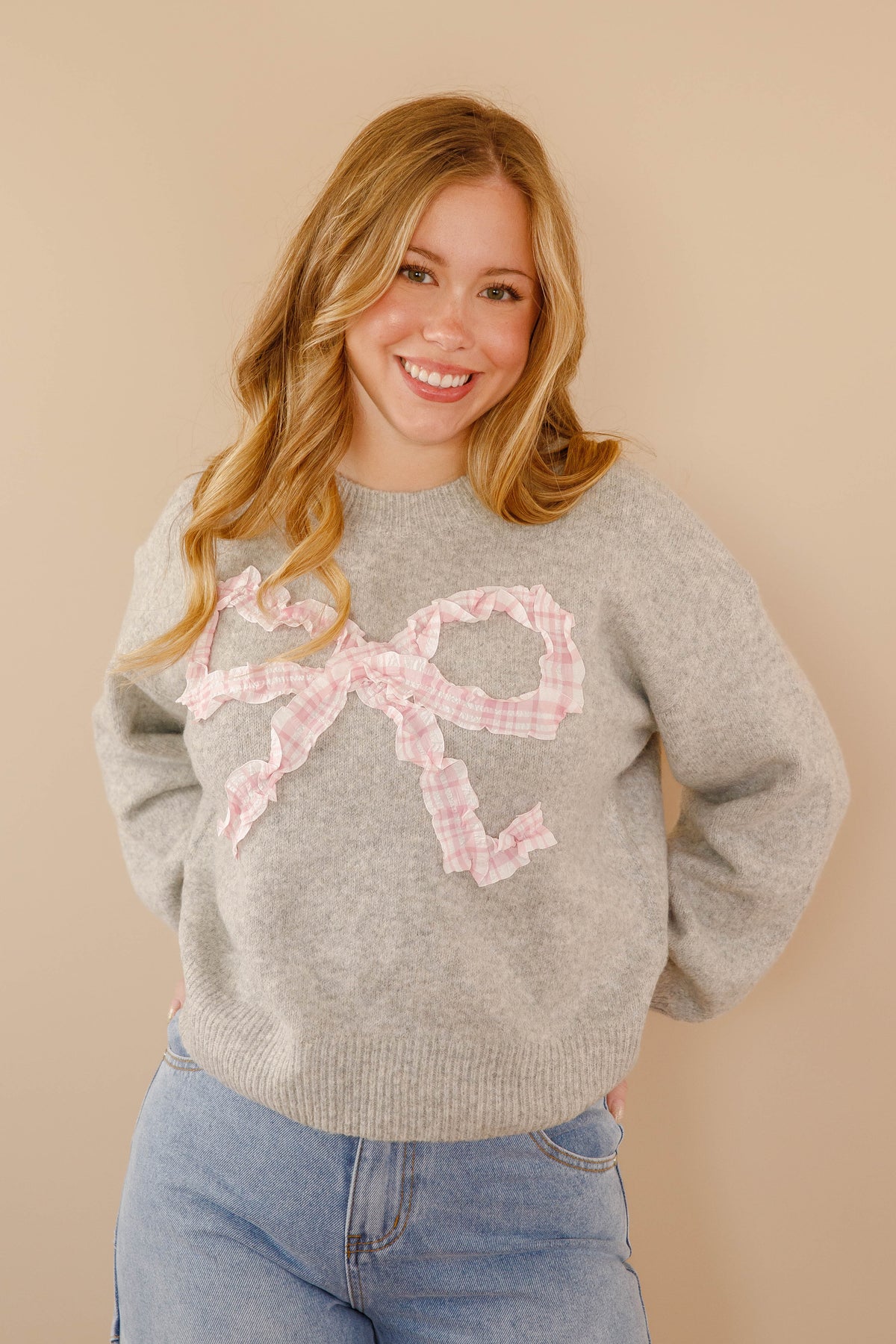 Cozy up in this charming grey knit sweater that strikes the perfect balance between laid-back comfort and effortless style. The relaxed fit drapes beautifully while the slightly cropped length keeps things modern and flattering. But here's where it gets fun—a delightful pink gingham bow adorns the front, adding just the right touch of whimsy and personality. Whether you're going for sweet or sassy, this sweater lets you have it both ways!