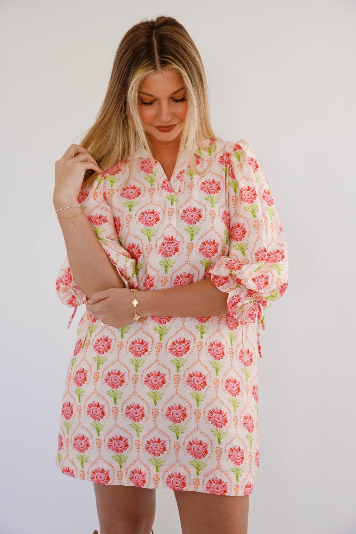Meet your new go-to dress! This breezy shift style combines comfort with personality, featuring a relaxed fit that's perfect for all-day wear. The collar and three-quarter sleeves with cinched tie details create a flattering frame, while the adjustable waist tie lets you dial in your ideal silhouette. Splashed with a cheerful mix of orange, pink, and green florals, this dress is ready to brighten up your closet and turn heads wherever you go!